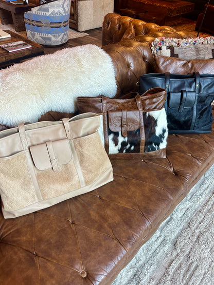 A Glitzy Bella Original, this bag is a work of art. Handmade in California. Prepare for endless compliments on this incredible piece! No two bags will be alike, because of the differences in cowhides. That is the beauty of natural leather and cowhide. No returns on this item as they are handmade to order. Bag is carry on size approved.