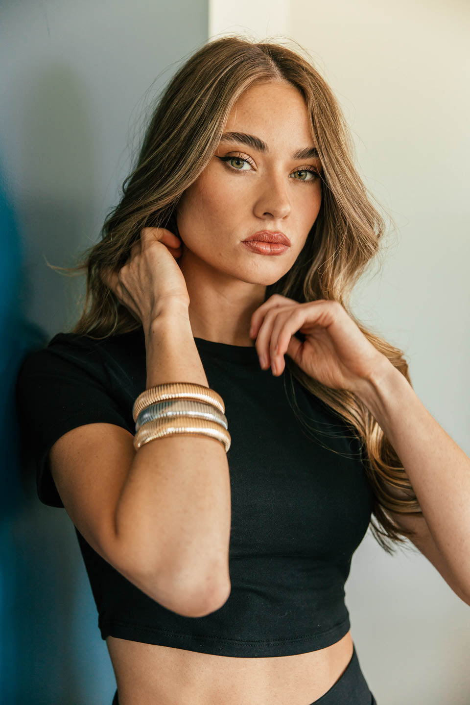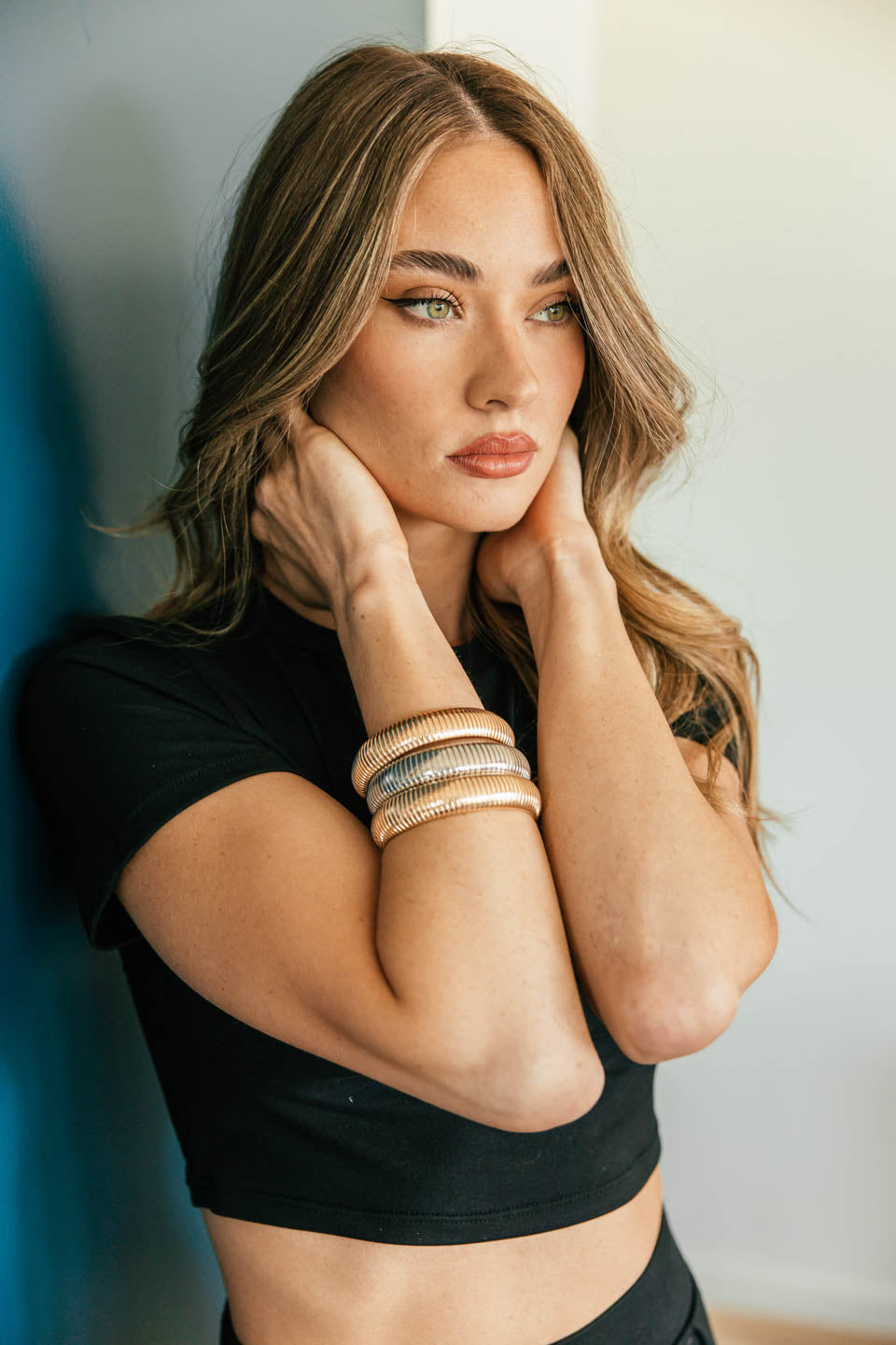 The Golden Hour Flex Snake Chain Stretch Bracelet Set, a must-have for the modern woman who exudes elegance and grace. Crafted with a touch of magic, these bracelets effortlessly elevate any outfit, adding a golden glow to your wrist. Embrace your inner goddess and shine with confidence. And layer it up. These bracelets were made for it.