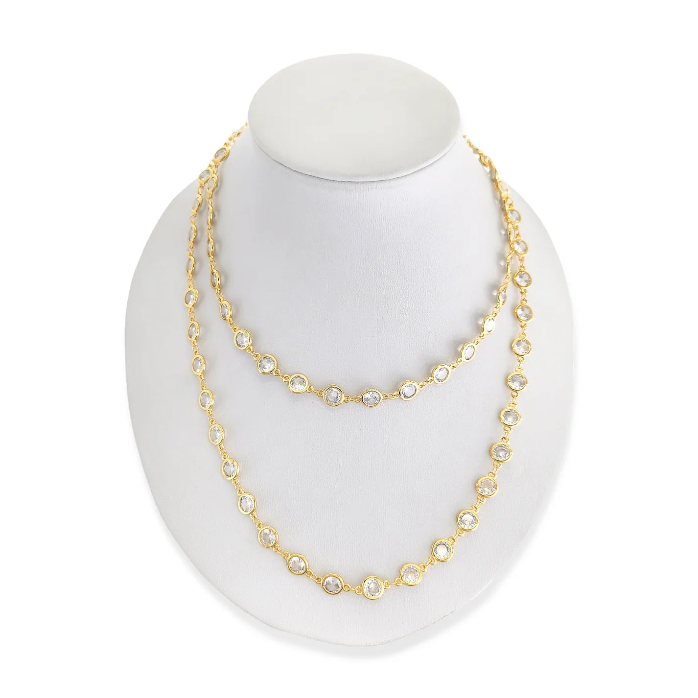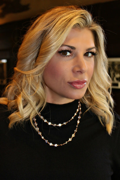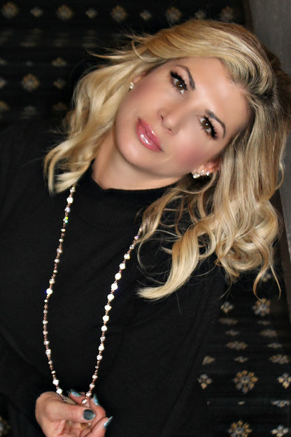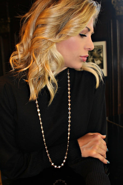 This delicate necklace is handcrafted with 68 of the most brilliant Swarovski crystals on a 36" chain encircling your neck. This unique combination results in a design with high shine and elegant luster. Shine bright in this classic piece, a versatile necklace that can be worn long, wrapped or layered and makes the perfect gift! (If you purchase all 4 color options, you receive a savings of $20.00.)