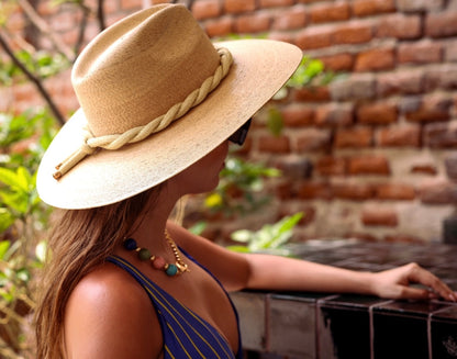 Another gorgeous straw panama to add to your collection!! The glamorous Riviera hat is the perfect straw hat to offer full sun protection. The crown is embellished with gold rope trim and the body is braided by artisan hands and interlaced with palm leaves to create the finished design. Hat has a sealer on it making it water resistant.