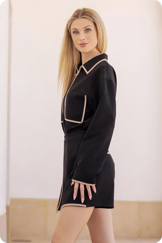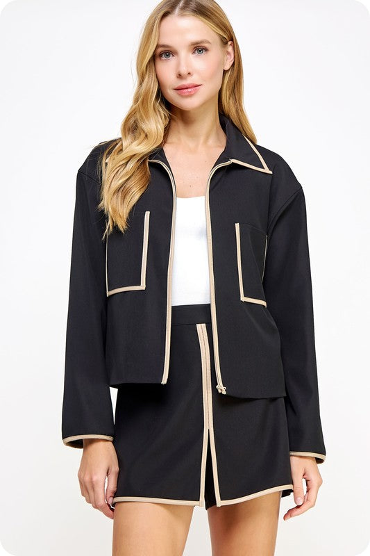 Elevate your cool-girl western style with the Chloe Jacket and Skort Set. With its sleek fabrication, the Chloe blends classic details with a modern cropped cut, offering a hint of attitude. Faux leather piping detailed jacket and skirt set in stretch suiting fabric. This skort and jacket set features faux leather piping detail throughout.