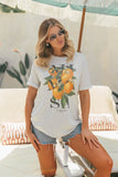A playful and nostalgic graphic print showcasing "MIMOSA" as part of a collection inspired by Americana. The fabric feels luxuriously soft and smooth against the skin, offering a breathable, lightweight comfort due to its unique blend of 50% cotton and 50% modal butter jersey knit.