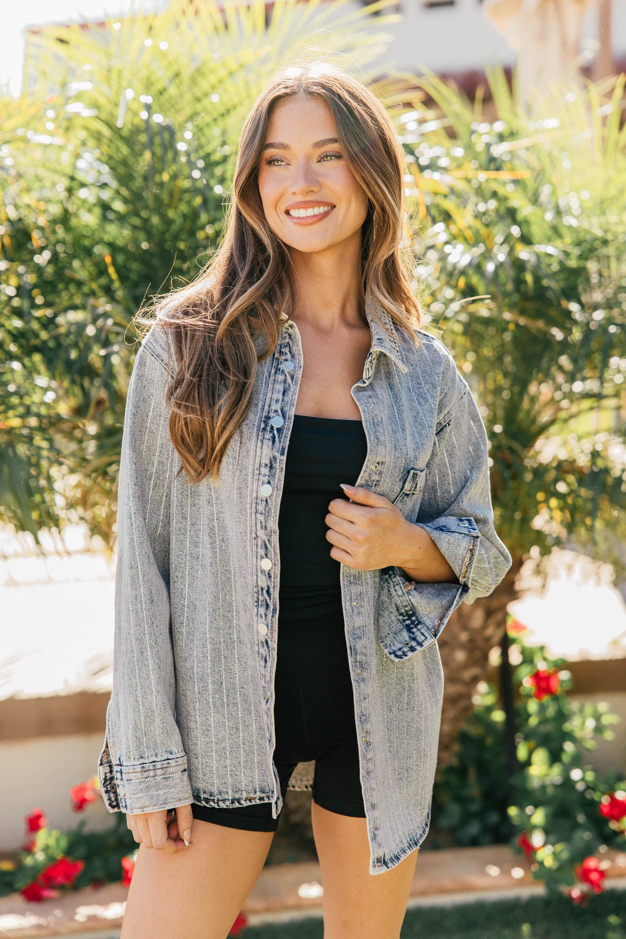 BEST SELLER!! Crystal Striped Denim Shacket in Blue Denim