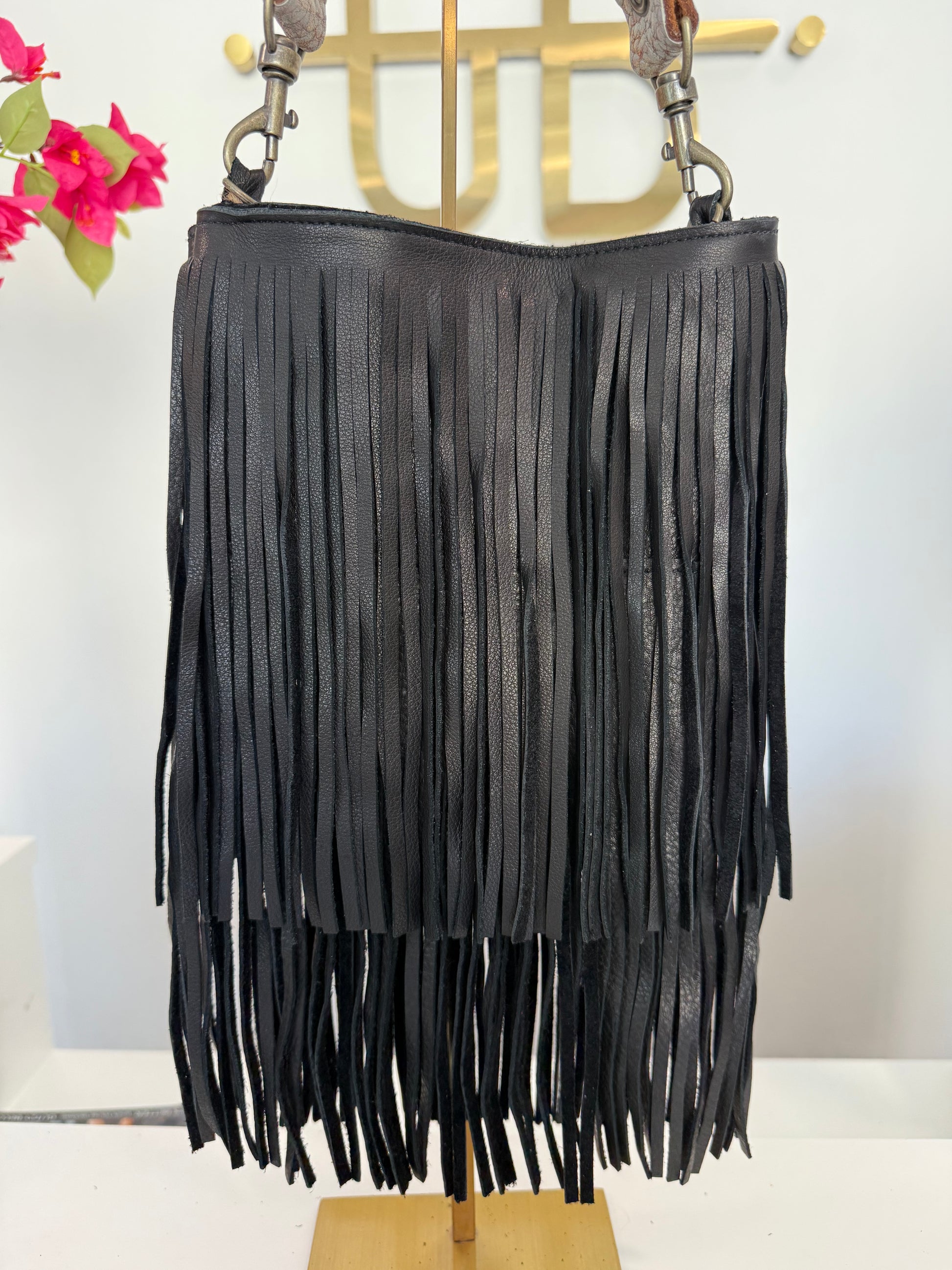 Black Fringe Crossbody w/ Silver Strap