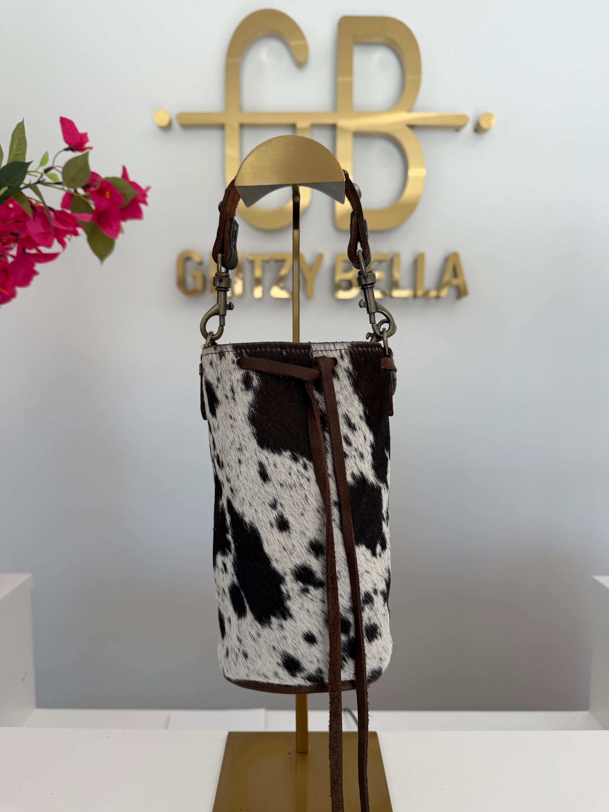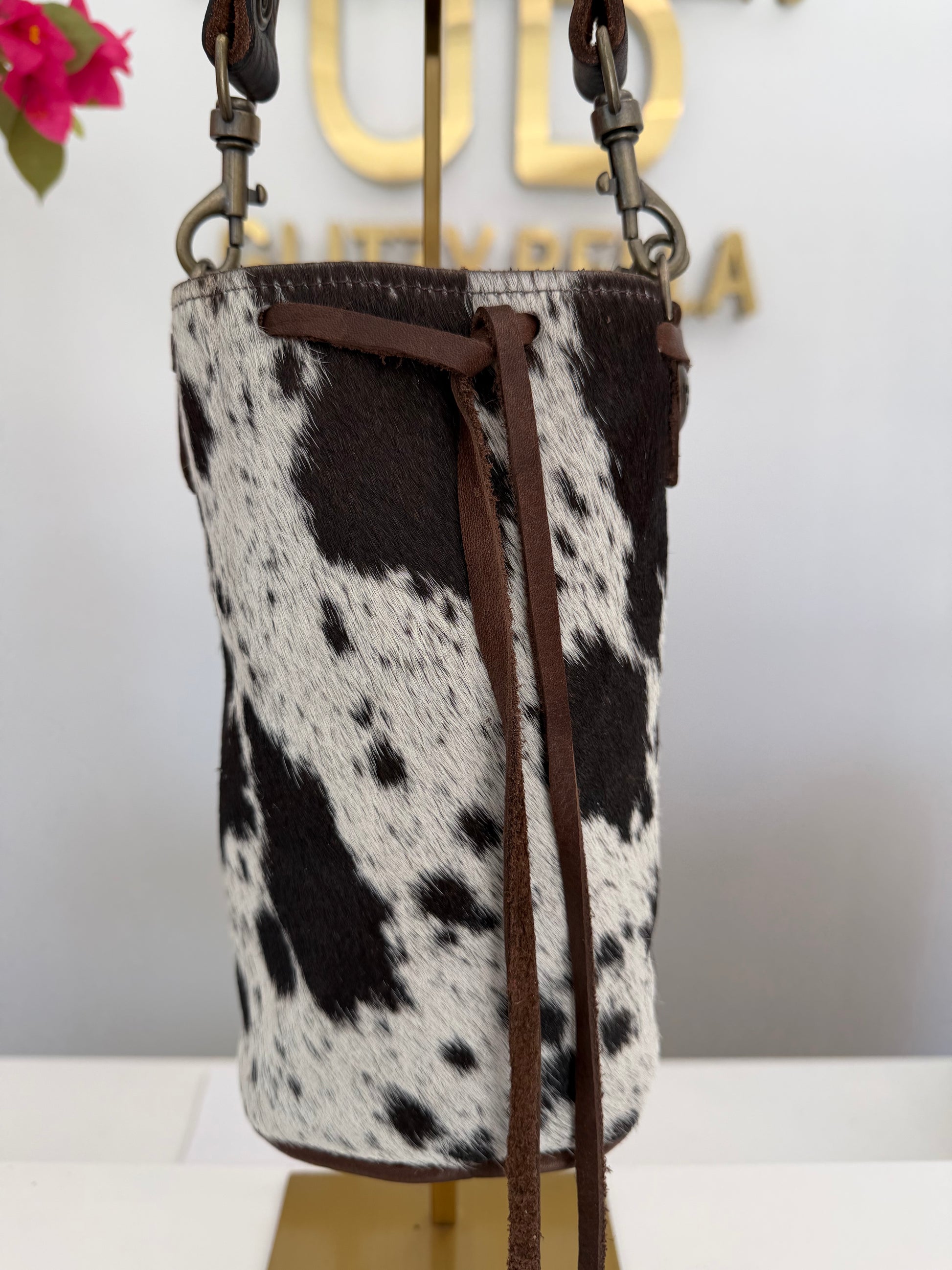 Brown and White Cowhide Bucket Bag Small Drawstring w/ Brown Strap