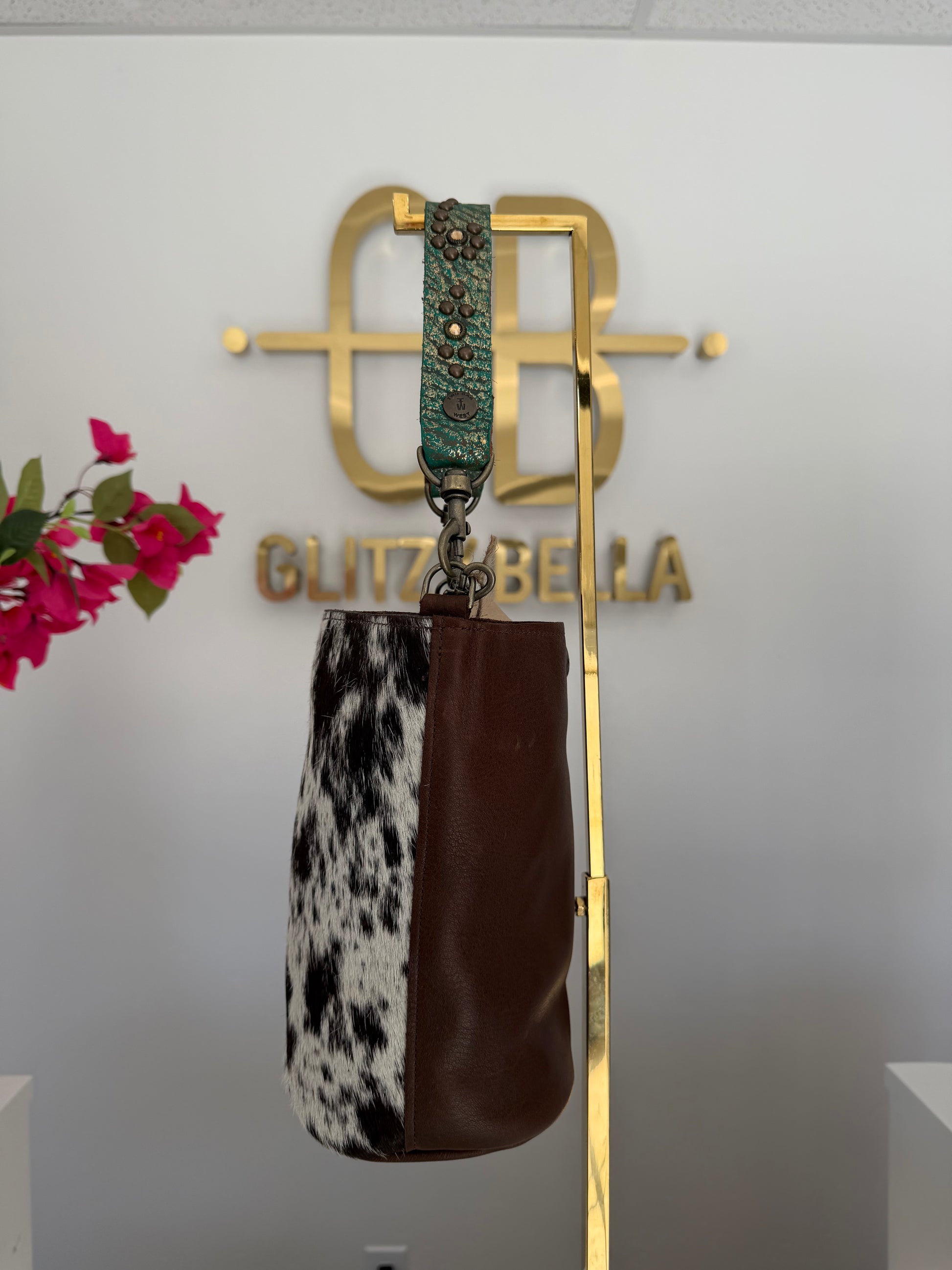 Brown and White Cowhide Small Bucket Bag w/ Turquoise Strap