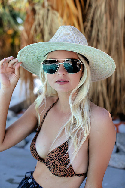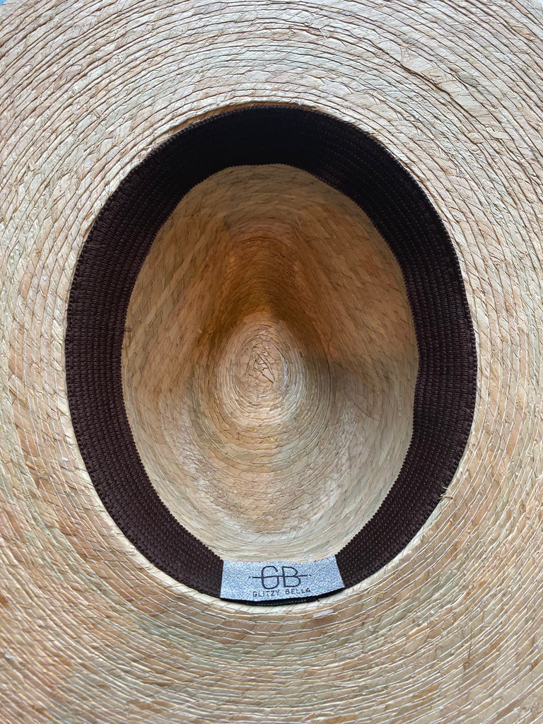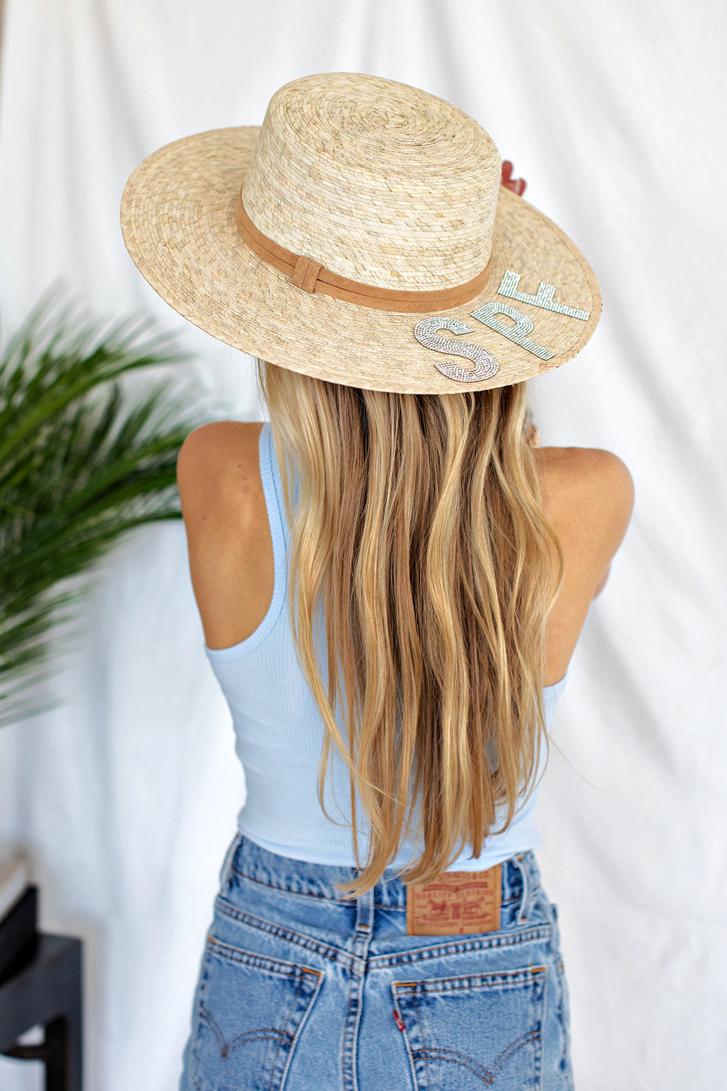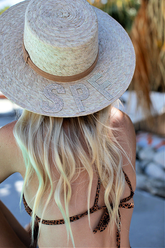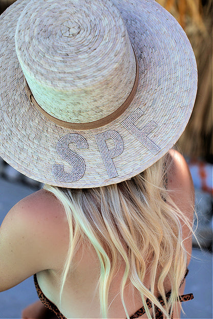 Handmade by artisans in Mexico, our new 100% baked palm leaf SPF Straw Hat is perfect for spring and summer wear. Featuring a molded crown and tightly woven pressed palm, this hat offers the most sun protection. Embellished with a faux suede band and crystal lettering. Available in the rancher or boater style straw hat.
