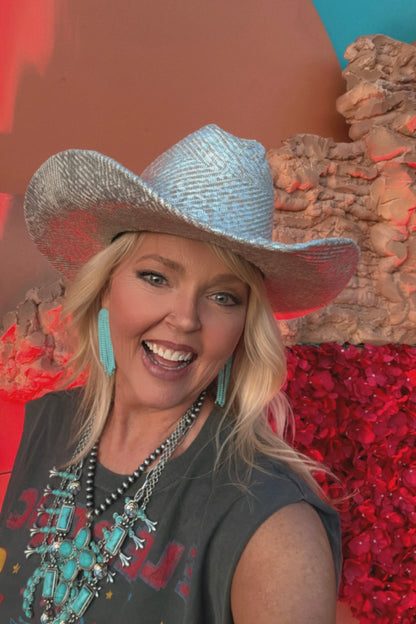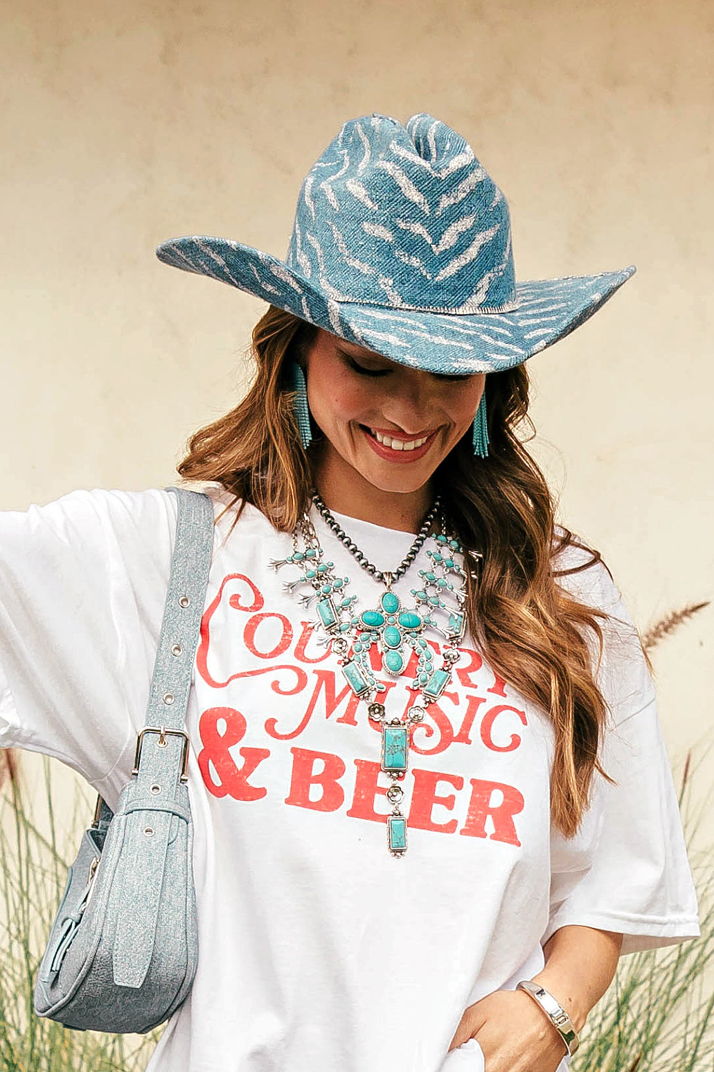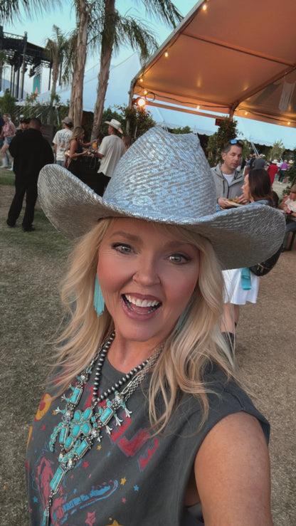 Crafted from a thick antiqued silver-tone chain with turquoise-colored stones throughout, these western-inspired necklaces are the perfect piece of fun jewelry to add to your country concert outfit!