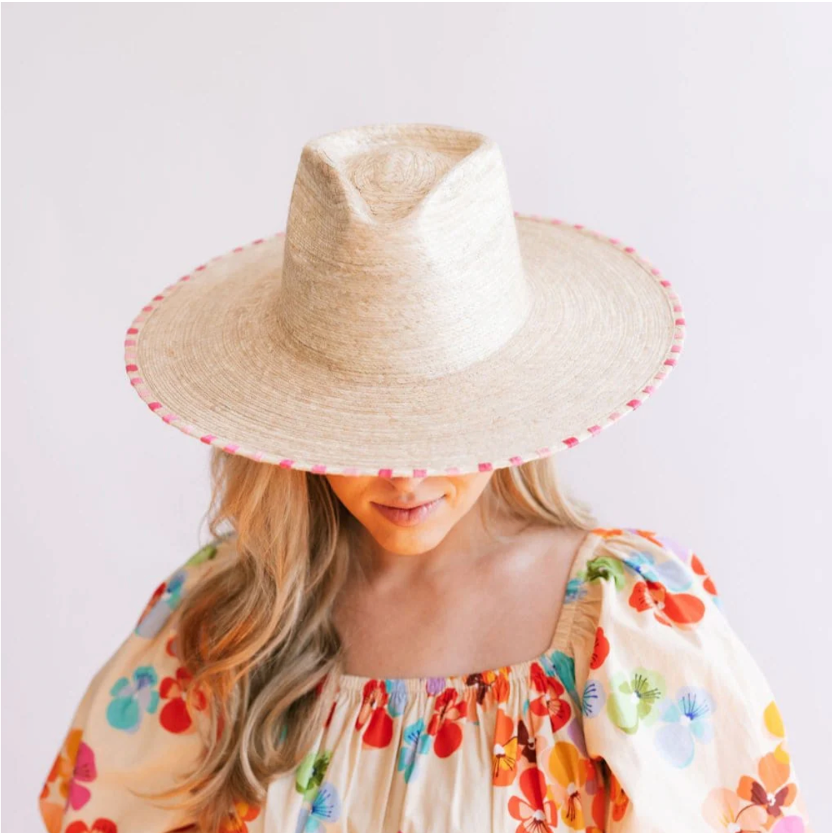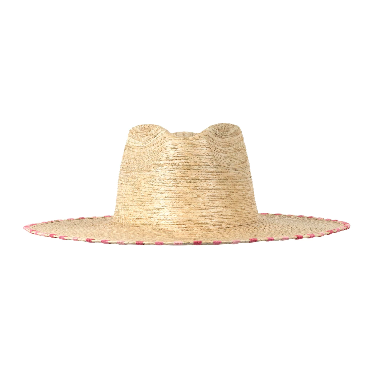The Adelina Palm Hat comes without the band and features hand stitched pink stripes along the brim and is a part of Sunshine Tienda's sustainable, fair trade hat collection and rated UPF 50+, the highest possible UV protection.