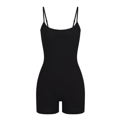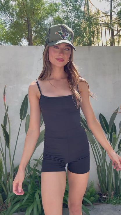 This is a body-hugging romper with a straight neckline and scoop back. It’s made for the active girl on the go — versatile, body-hugging fabric that’s sweat-wicking and cottony soft. Style it alone with sneakers and a ball cap, or throw a denim jacket over it for a chic look!
