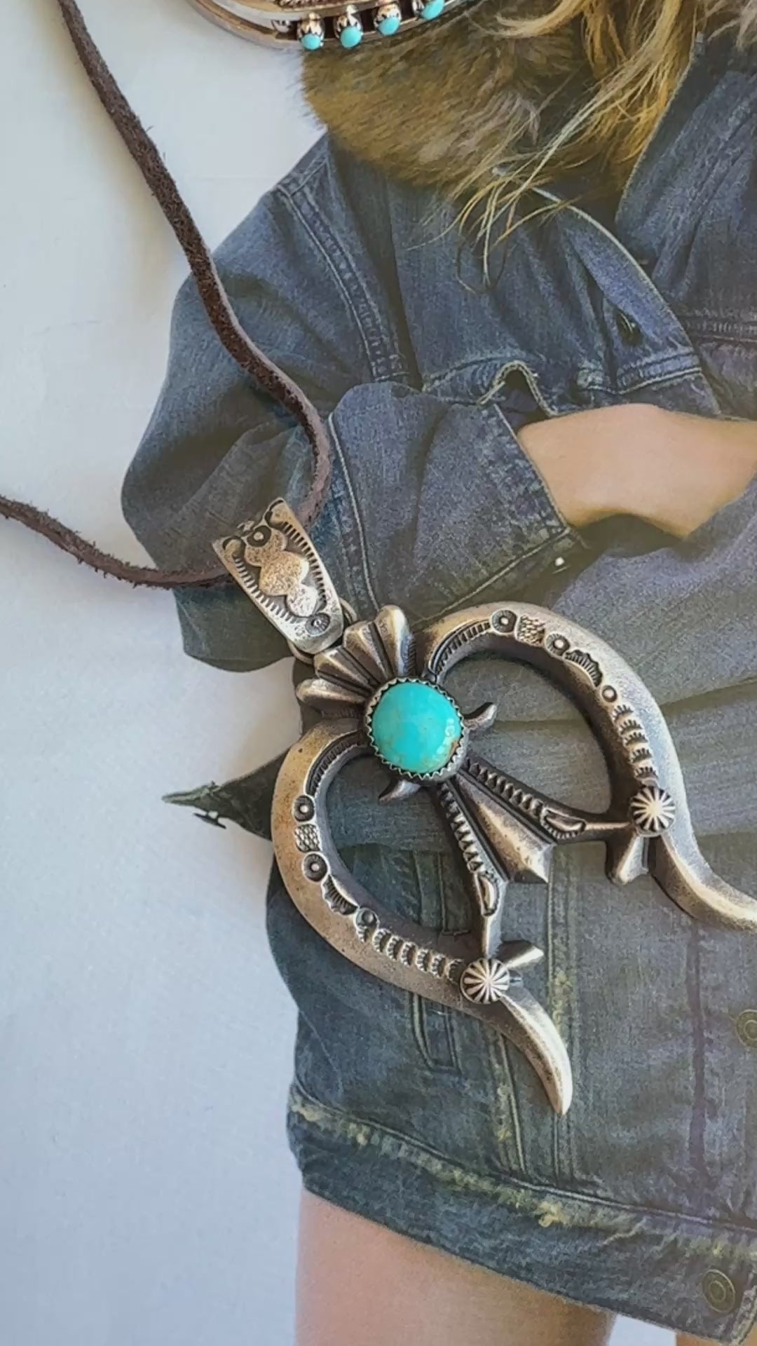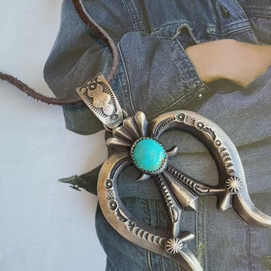 As seen on Bella Hadid! This handcrafted Navajo necklace showcases a sterling silver pendant accented with a single, exquisite Kingman Turquoise stone, suspended from a durable suede rope chain. Each piece is made by hand by Native American artisans and may vary slightly.