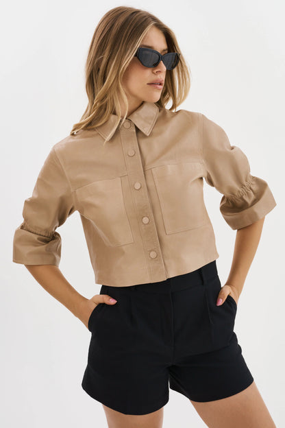 The CAROLINA Leather Ruffle Sleeve Jacket is a feminine twist on a classic shirt jacket. It features a cropped length and ruffled cropped sleeves for an unexpected playful silhouette. Pair it with jeans and a tee for a free-spirited off-duty look, or dress it up with leather trousers and heels for a more sophisticated look.