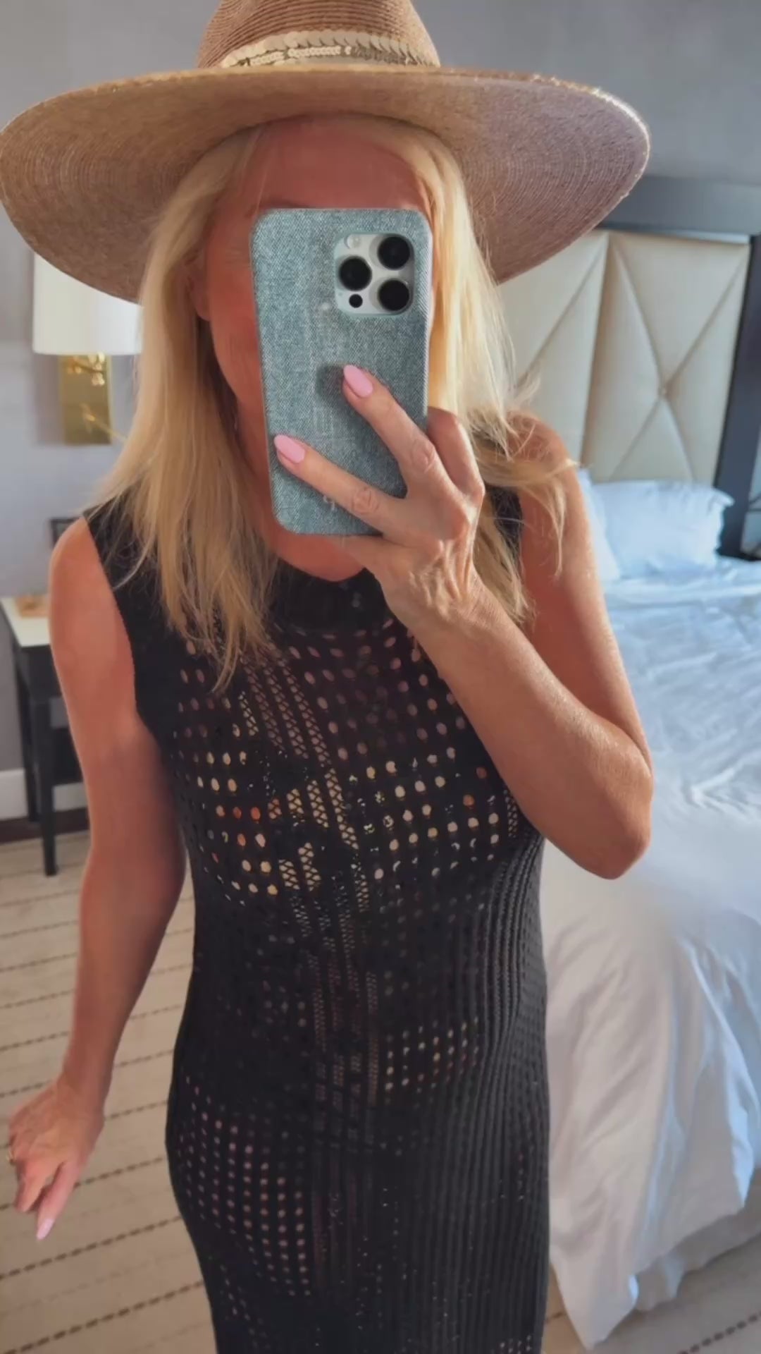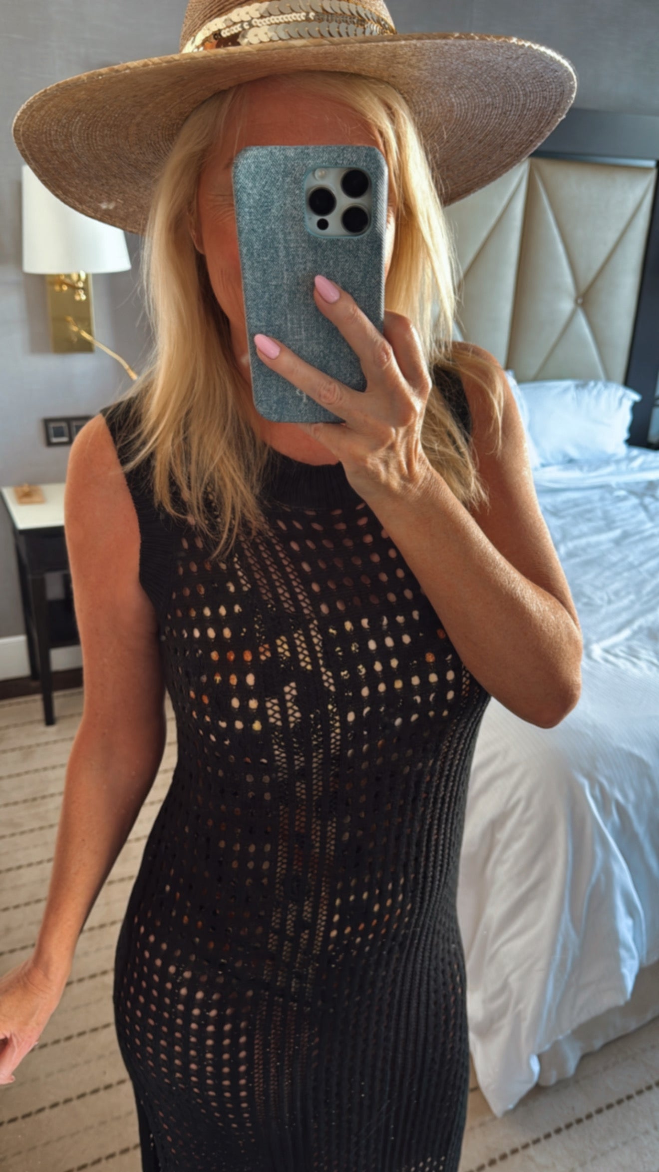 They don't get any cuter than this cover up! On trend in crochet, lightweight and flattering, what else can you ask for! Stretchy fabric, with a rounded neck and side slit. Shelly is wearing a medium for reference.