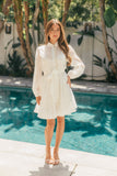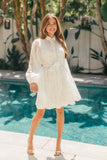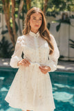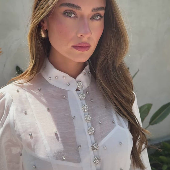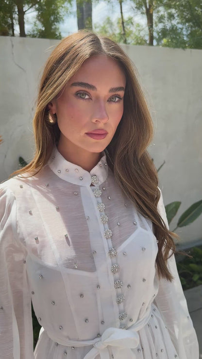 Talk about a statement dress! Whether you're headed to a wedding, or a fancy party, this dress can take you so many places! This dress features a sheer fabrication, rhinestone detailing throughout, a high neckline, functional button front, back zipper (so you don't have to do all the buttons!), and a tiered bottom hem. Style it with some heels to dress it p, or make it more casual with strappy sandals for an event during the summer!