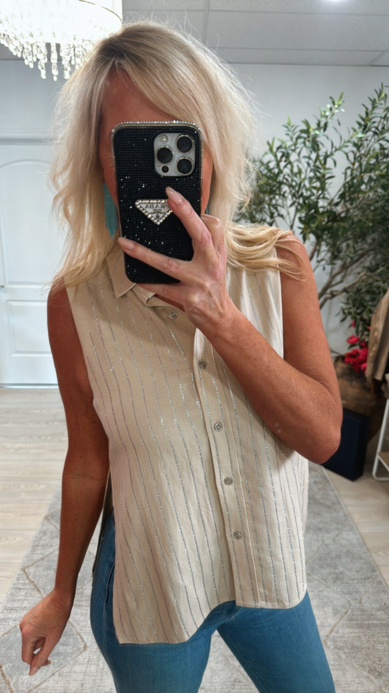 Such a great statement top! Its button-up design is accentuated by rhinestoned details that add character and personality. This top blends the classic with fabulous, exuding a cool girl appeal!