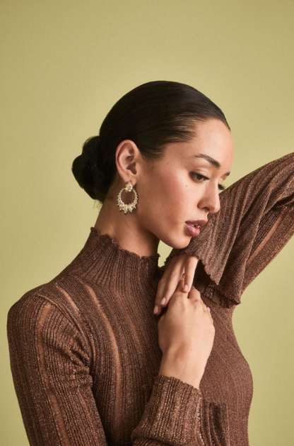 These earrings are the accessory you've been searching for. The Dionne Earrings add a touch of glam with their intricate design and bold silhouette—perfect for making any look pop, 1.8"