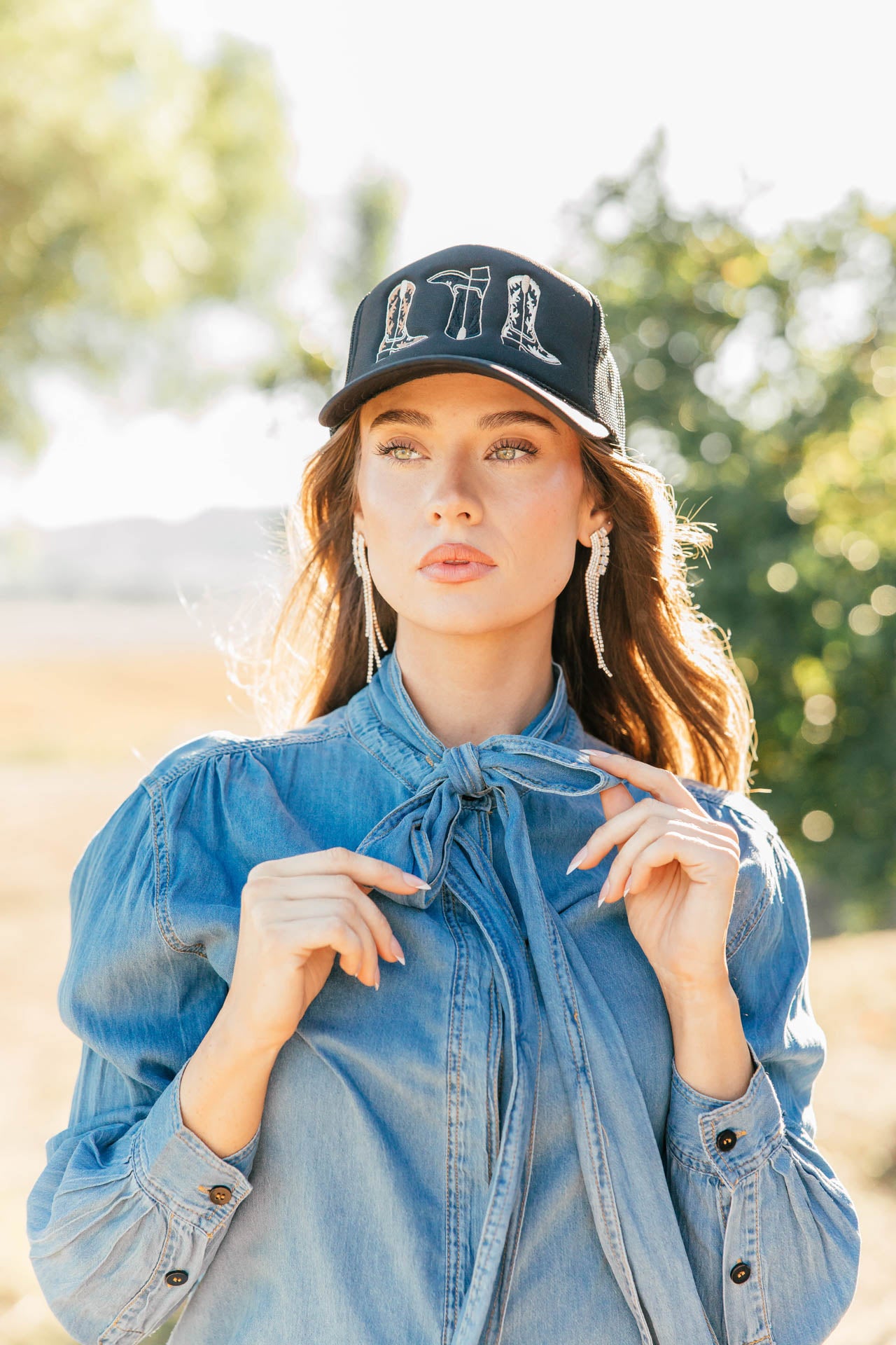 Our newest trucker hat with 3 embroidered cowboy boots in the perfect neutral fall colors! Available in three colors.