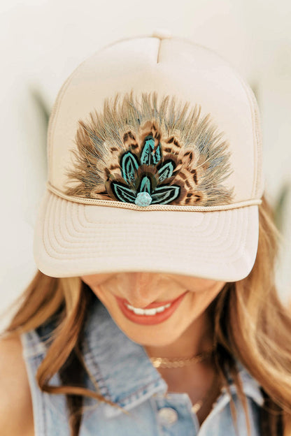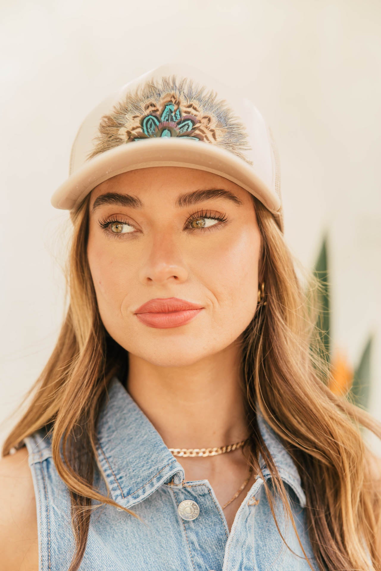 Stand out at country concerts with our NEW Feather Trucker Hat in Tan! Each trucker hat features a unique feathers, making it one of a kind. Be the center of attention with this quirky and fun addition to your wardrobe. (Limited stock, so grab yours now!)