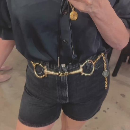 The Horse Bit Chain Belt channels vintage equestrian elegance with its sleek gold-plated chain and refined silhouette. Sourced from Italy and finished by hand in Los Angeles, this high-end belt is effortlessly chic — perfect over dresses, blazers, or high-rise denim.