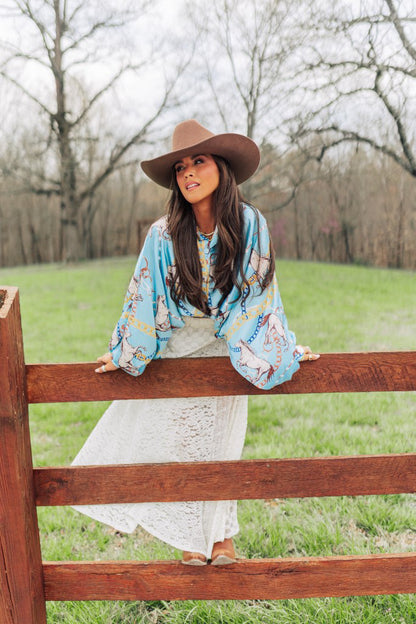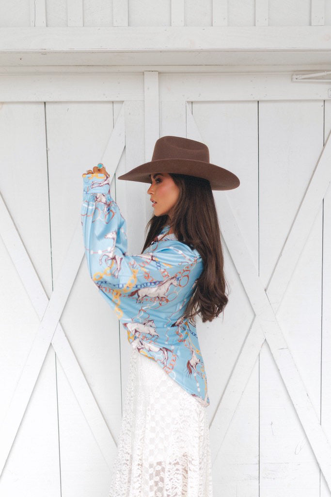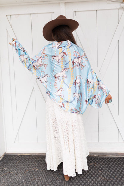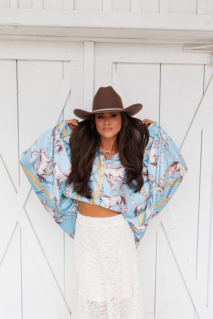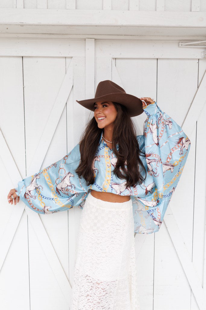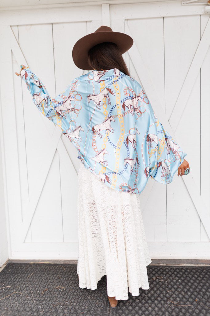BEST SELLER!! Horseprint Satin Top in Blue
