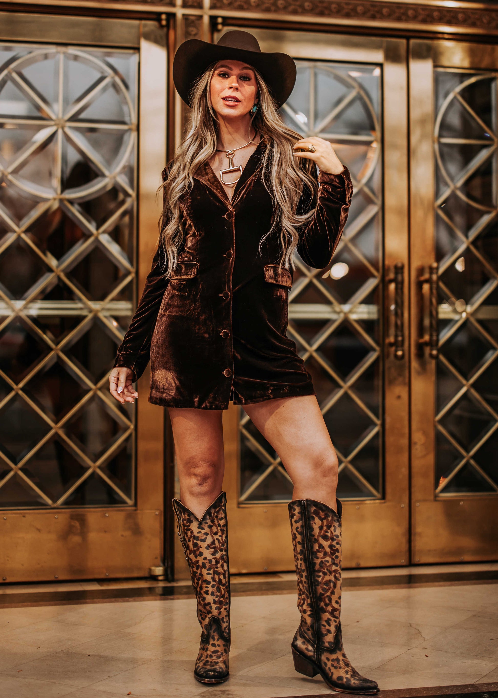 An elevated and Western-inspired update to your favorite LBD, the "Jolene" Fringe Blazer Dress is crafted from drapey velvet and finished with tassel fringe that effortlessly moves with you. This long sleeve blazer dress turns heads with its structured silhouette, soft velvet finish, and unexpected tassel detail cascading down the back. Made from a plush poly-spandex blend, it brings a bold, luxe edge to your night-out wardrobe equal parts tailored and dramatic.