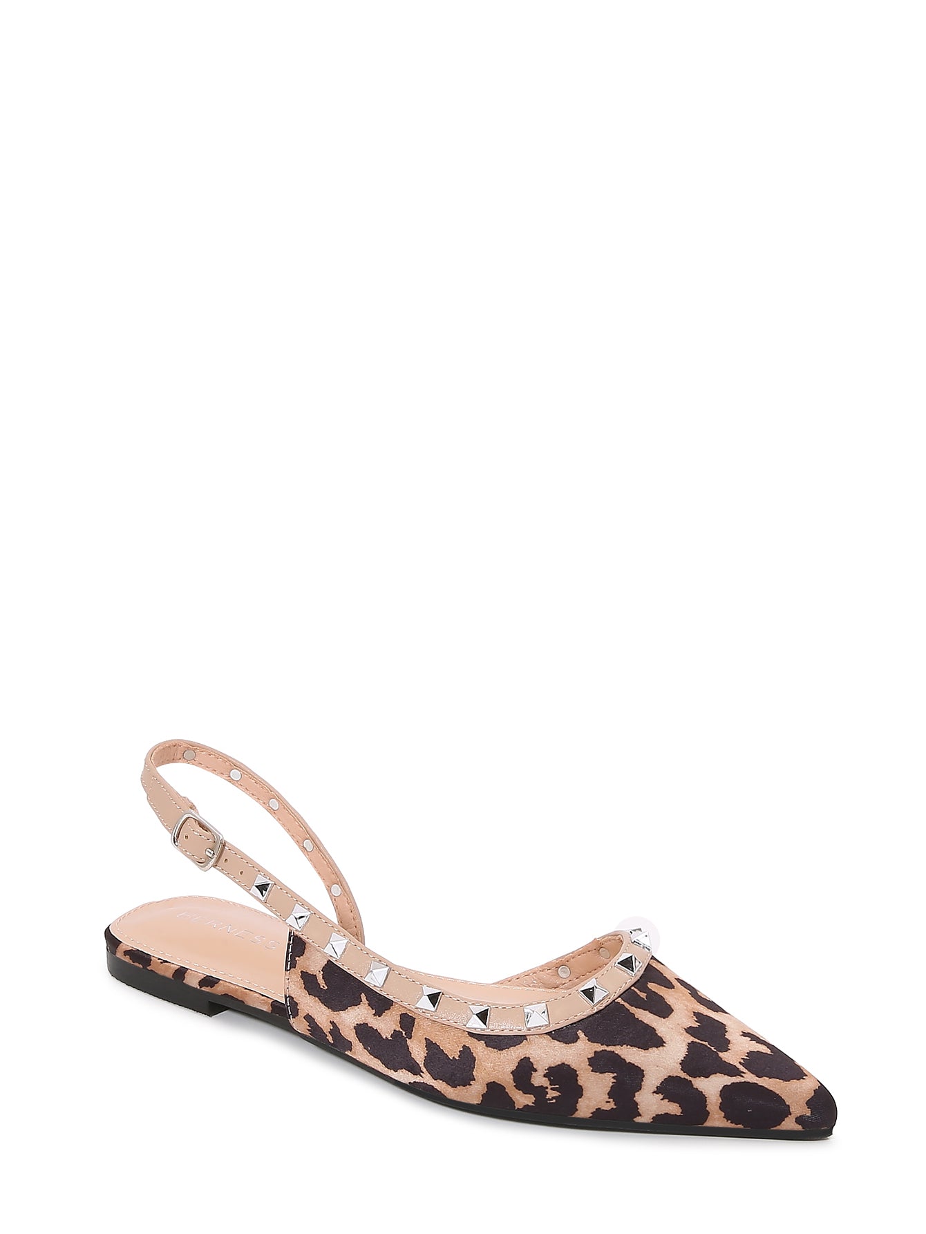Trendy for work, brunch, or running errands, the Coco Studded Flats in black and nude combo feature a pointed toe, sling back, and studded details. Size 5.5-10.