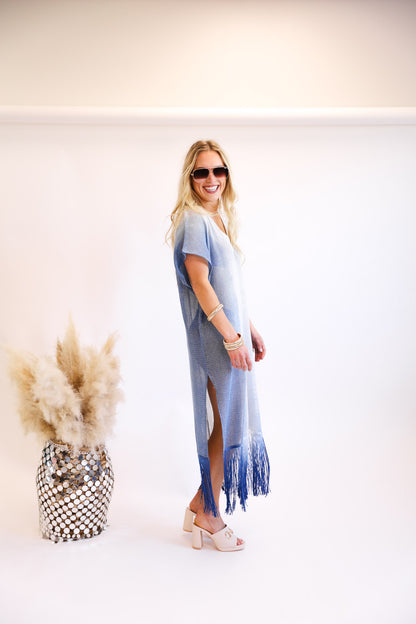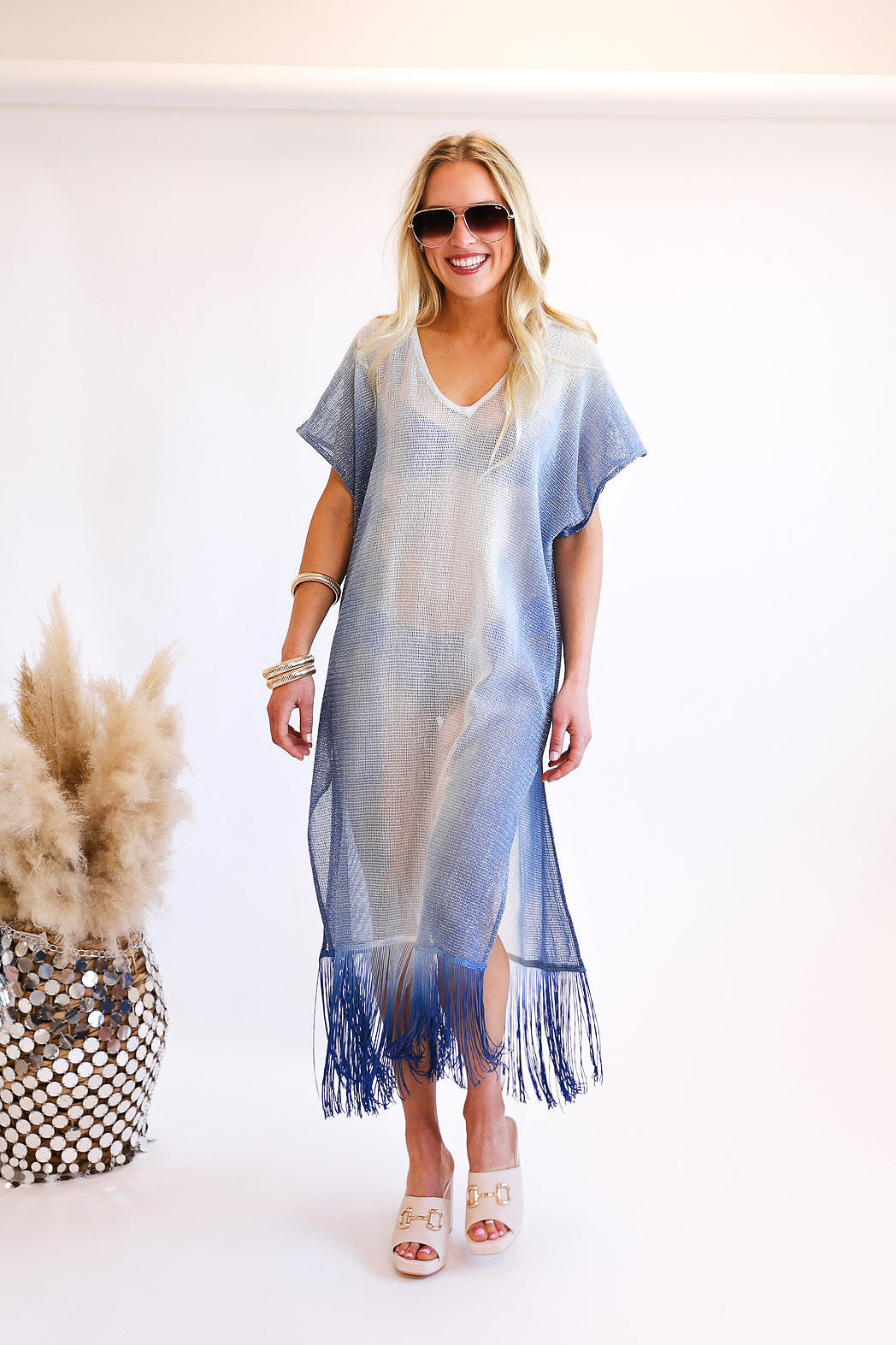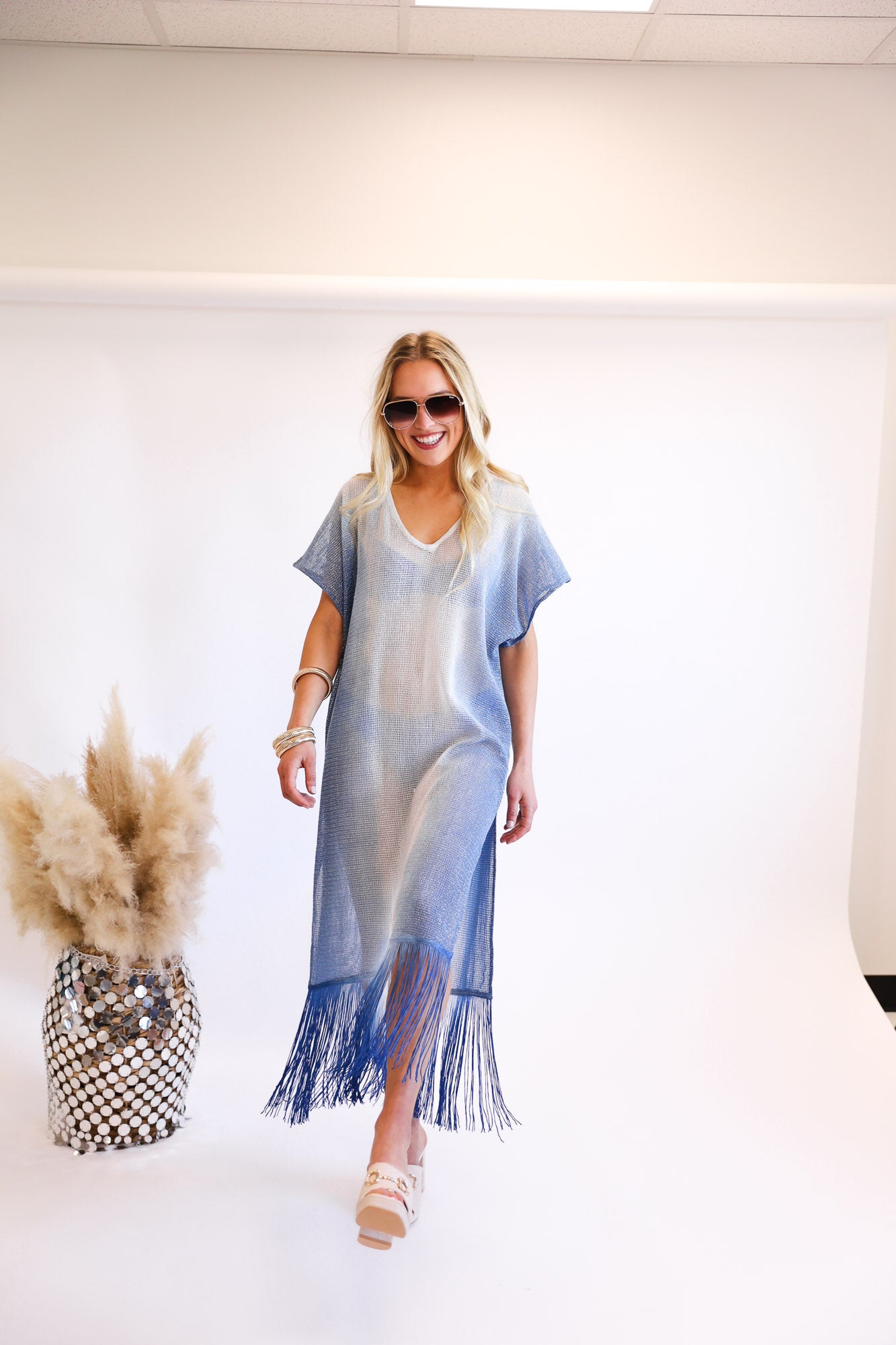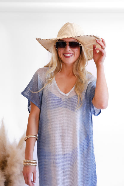 Your new favorite coverup for your next vacay, the new Metallic Mesh Knit Cover Up in Blue! Perfect for summer days, this coverup will have you looking stylish and feeling comfortable.