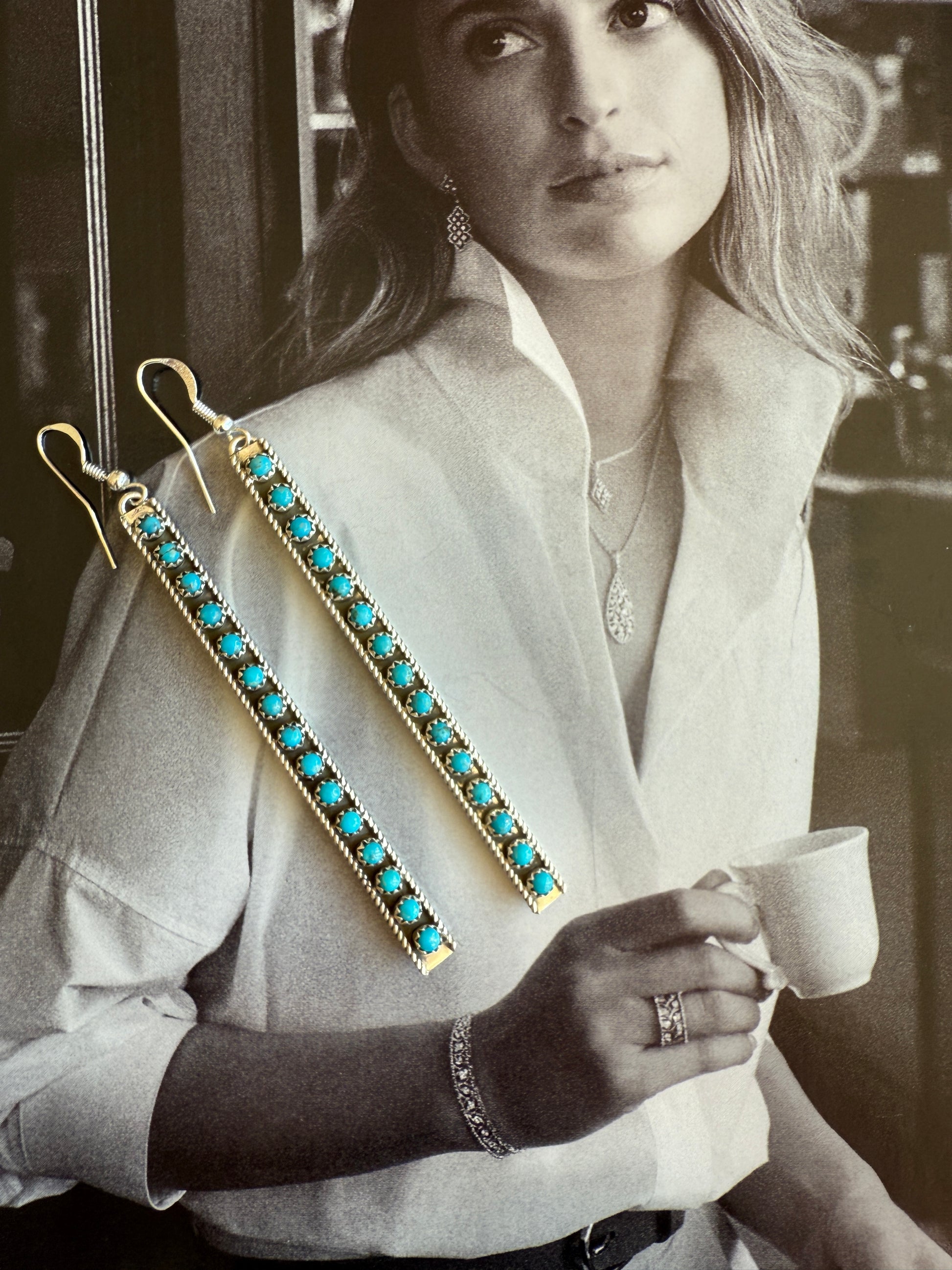 Crafted by Navajo artisans, these sterling silver earrings feature 15 carefully set Kingman Turquoise stones in each piece, showcasing exceptional craftsmanship and authentic design.