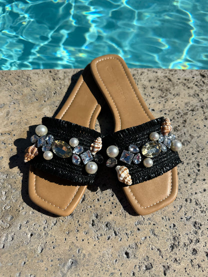 Easy to wear, hard to miss. Slip into the Off the Coast Seashell Slide and elevate your warm-weather looks with braided, raffia fabric and a pearl and seashell detail!