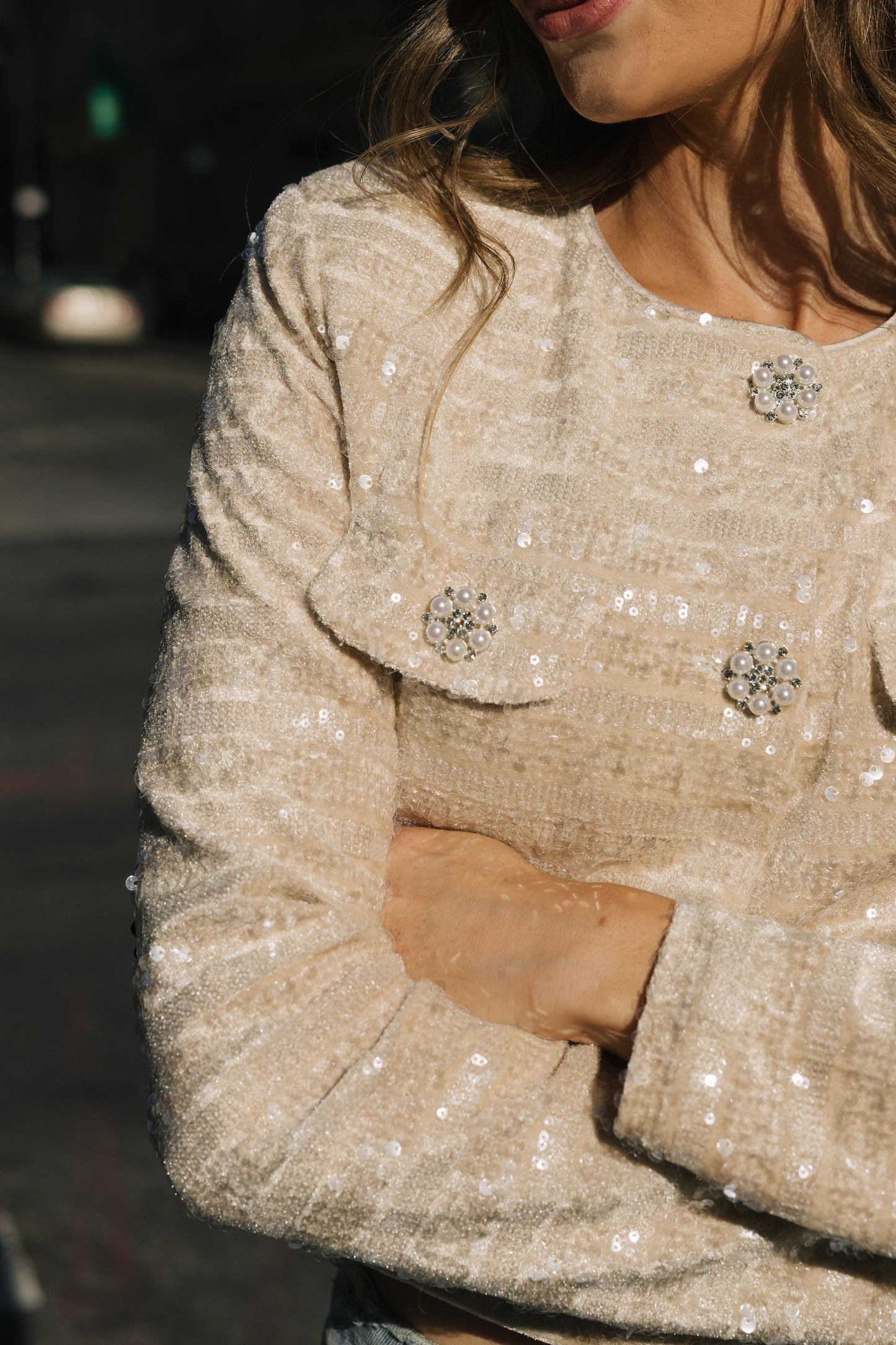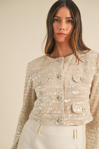 This sequin jacket is tailored to perfection with lightly padded shoulders for a structured silhouette. The front boasts crystal floral buttons for a subtle, sophisticated shine and faux breast pockets. Ideal for draping over a dress or pairing with tailored trousers, this jacket brings a timeless allure with a Tres Chic twist.