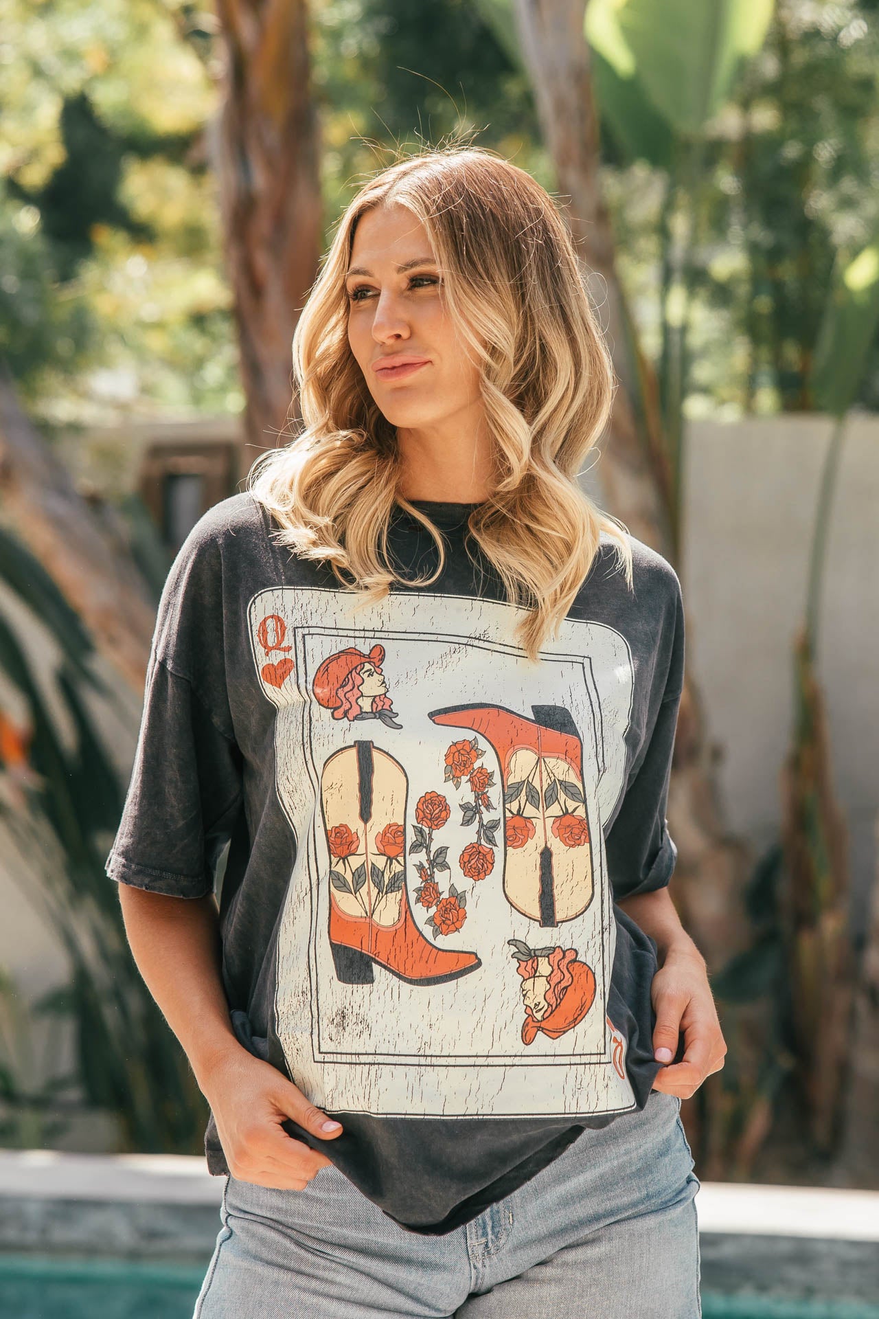 The Poker Face Graphic Tee is sure to be another favorite in your closet. Made with a washed, soft 100% cotton fabric and oversized fit, you'll feel comfortable while the card graphic is equal parts cute and edgy. Pair with baggy jeans for a casual weekend look or leather pants for an sassy night out vibe.