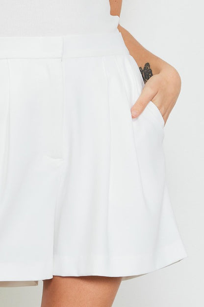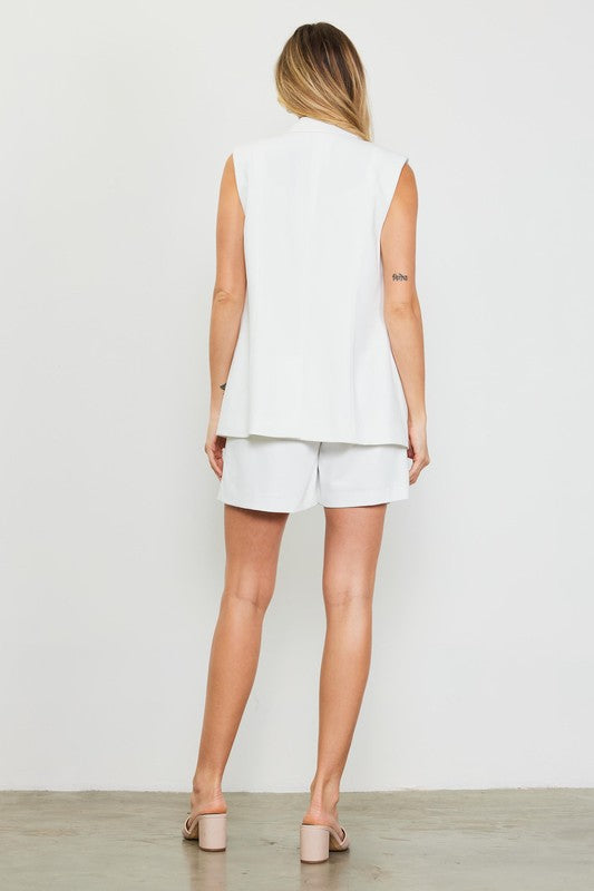 Every one needs a good pair of tailored shorts for summer! Perfect for when it is hot outside, but you need something dressier than denim sorts! These tailored shorts have a high waist and a crisp, clean look with pintuck detailing at the front. An elasticized back waistband make for a comfortable fit. Style with our Portia Tailored Vest!