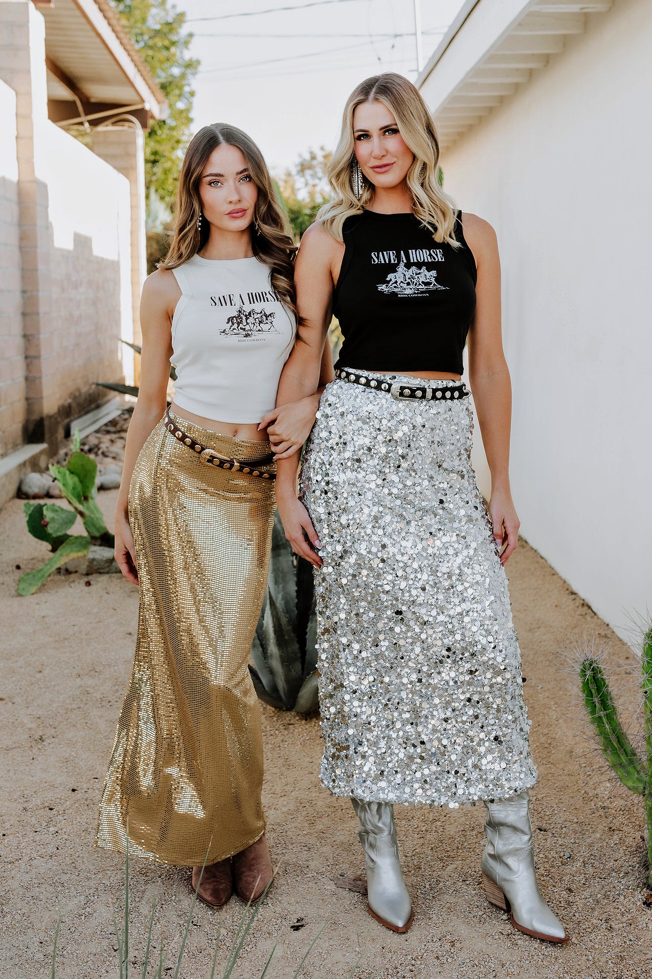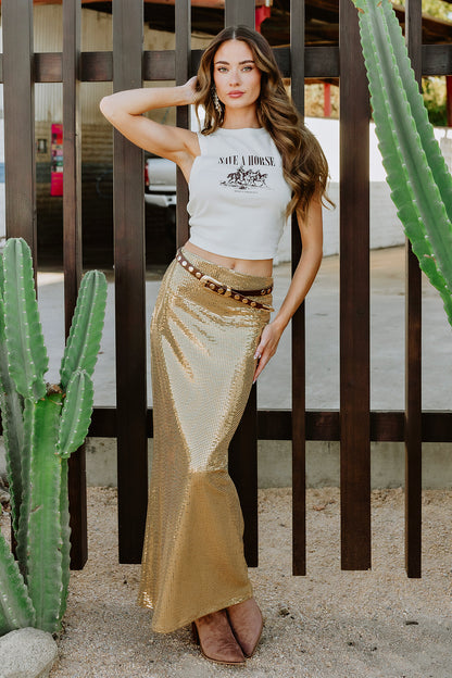Turn up the heat on your weekend look with our Saturday Skirt! This shiny gold maxi is the perfect match for a night out on the town!