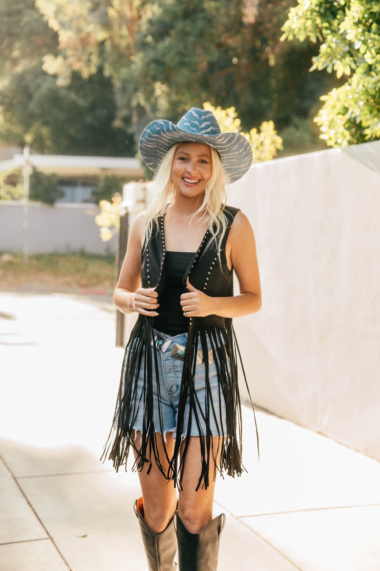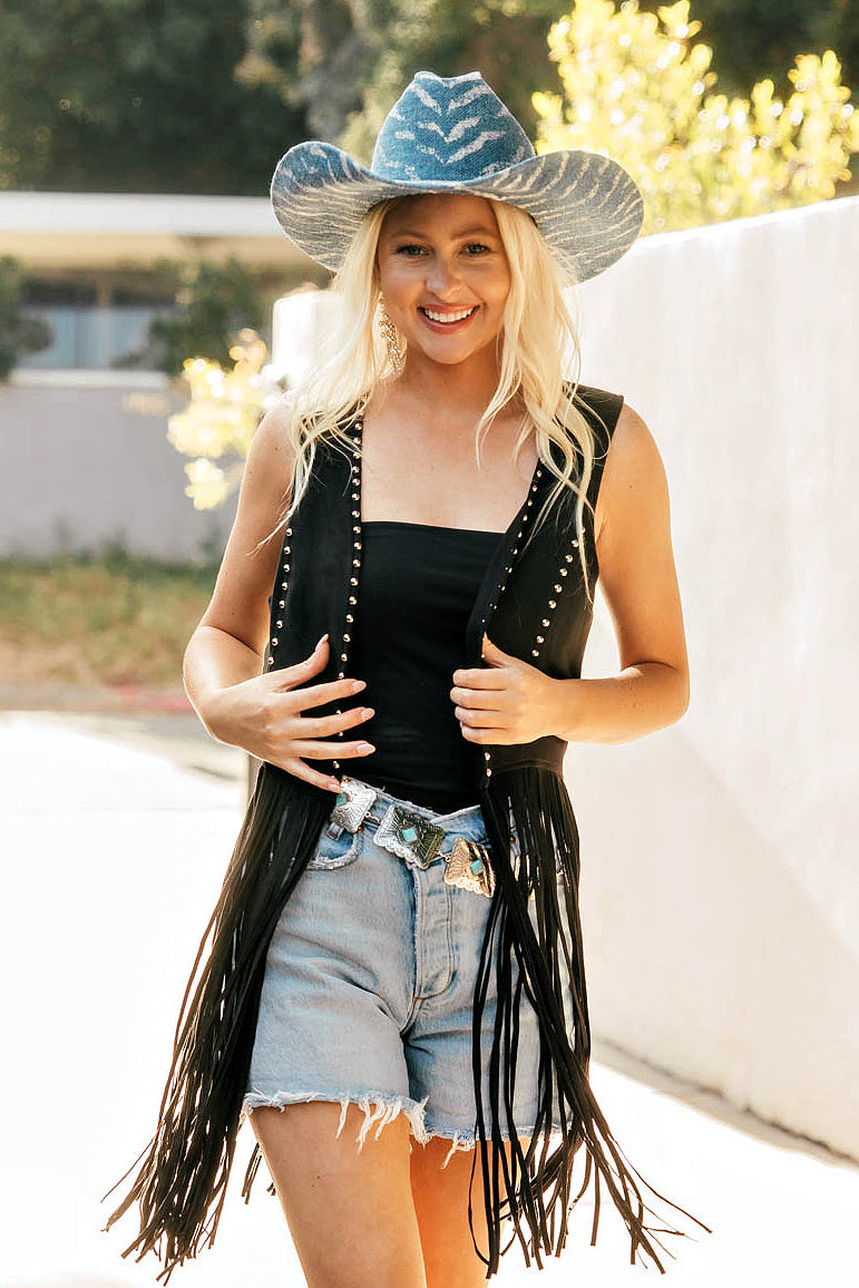 Your new country concert essential! Made from soft faux suede, this fringe vest features fabulous fringe and studded details on the front and back that sway with every move, adding a playful edge to your look. Style it with a basic white tank and your favorite denim and boots and you're set!
