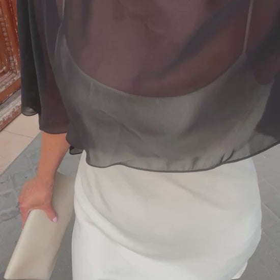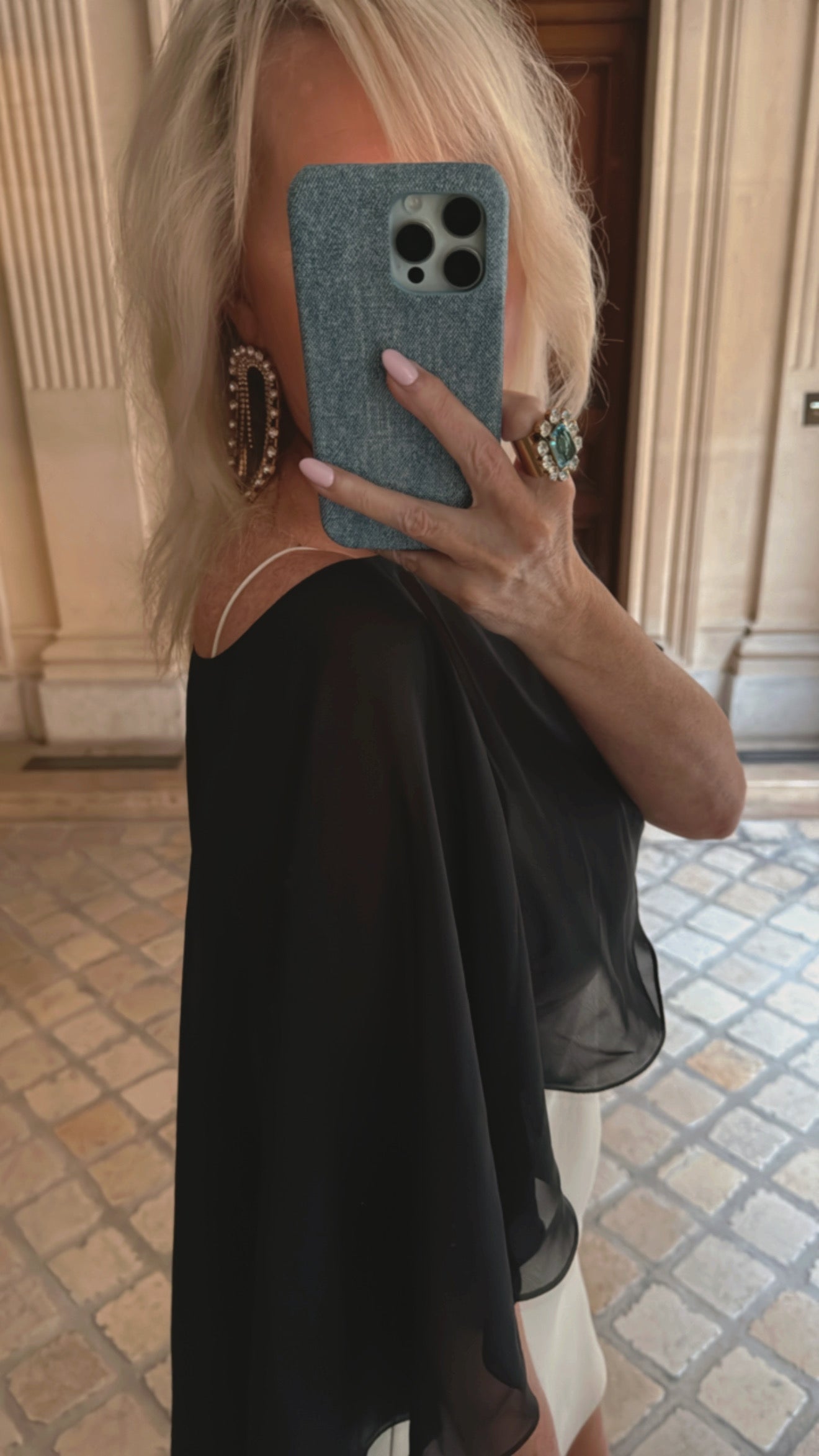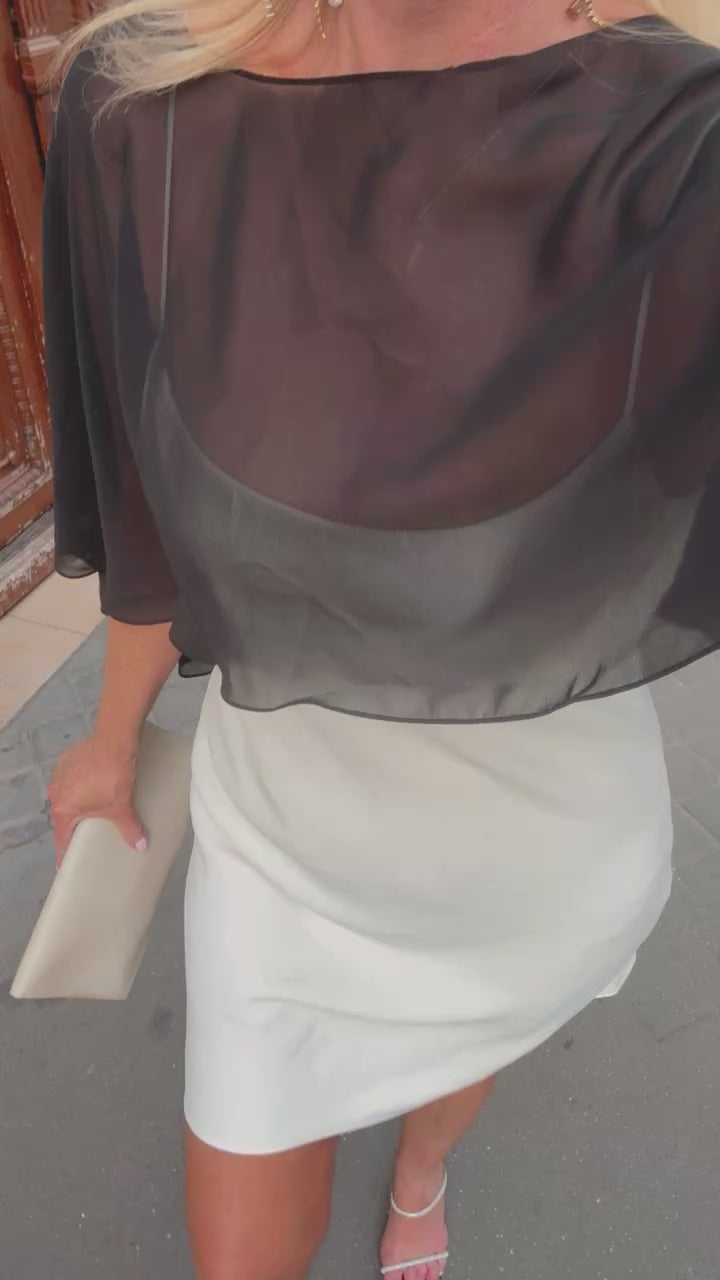 Effortlessly elevate your wardrobe with our NEW Sheer Cape. This elegant piece adds glamour to any outfit while providing coverage. Made of sheer fabric, it's the perfect addition to your wardrobe. Elevate your style with this must-have accessory.