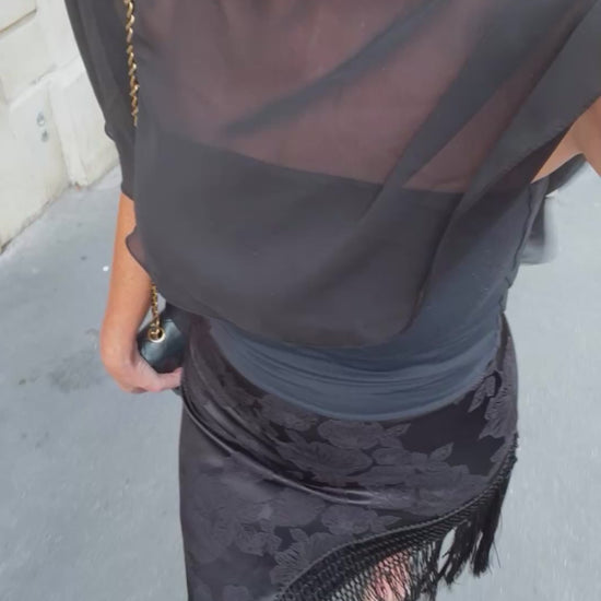 Effortlessly elevate your wardrobe with our NEW Sheer Cape. This elegant piece adds glamour to any outfit while providing coverage. Made of sheer fabric, it's the perfect addition to your wardrobe. Elevate your style with this must-have accessory.