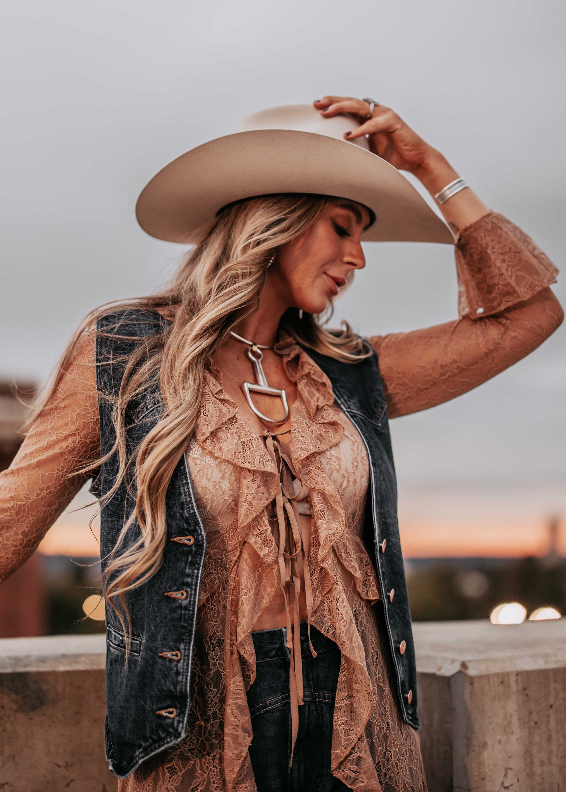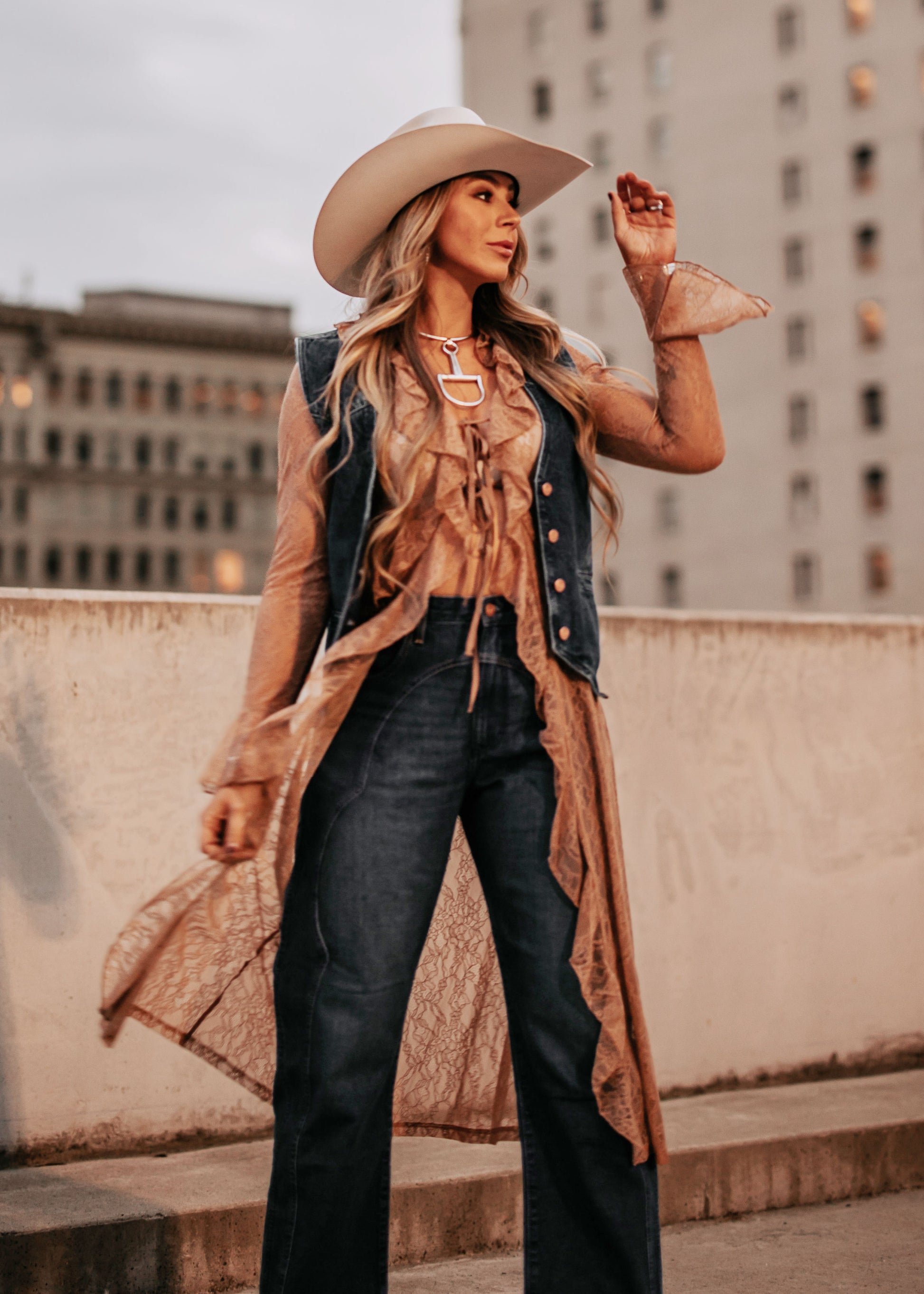 This lightweight sheer lace duster, adorned with a delicate floral pattern, features a flowing ruffle trim down the front that adds a touch of romance. The long sleeves end in flared cuffs for a flirty finish, and the adjustable front tie allows for a custom fit. With mid-calf length and softly scalloped edges, it’s an ideal dreamy layer to brighten up basics or dresses with a fun Western-boho vibe.
