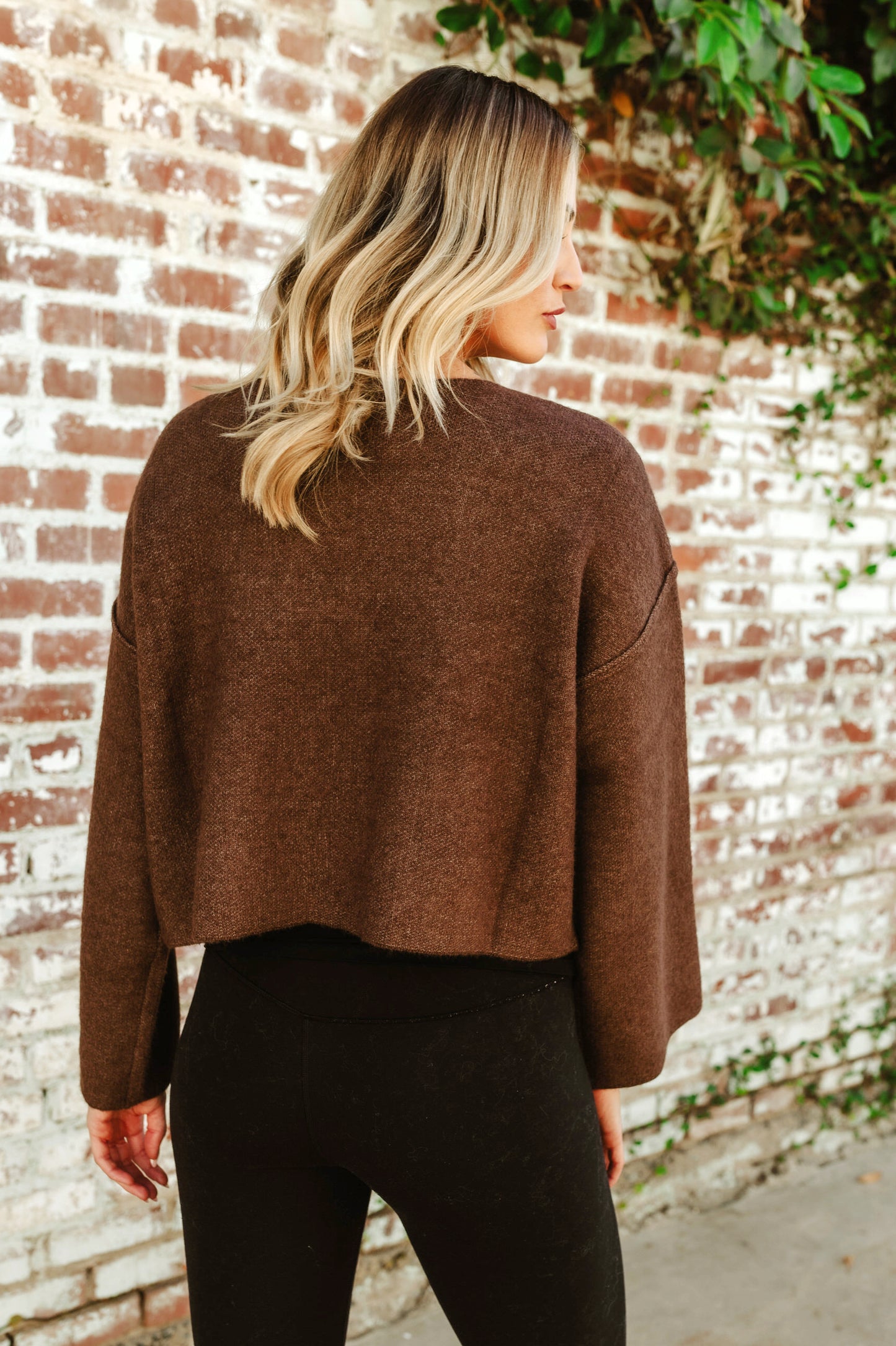 Made with comfortable, lightweight fabric, it's perfect for everyday wear. Pair it with your favorite jeans for a effortlessly cool look. This chocolate brown sweater features a high rounded neck, a contrasting bow design, a soft knitted texture and bell sleeves.