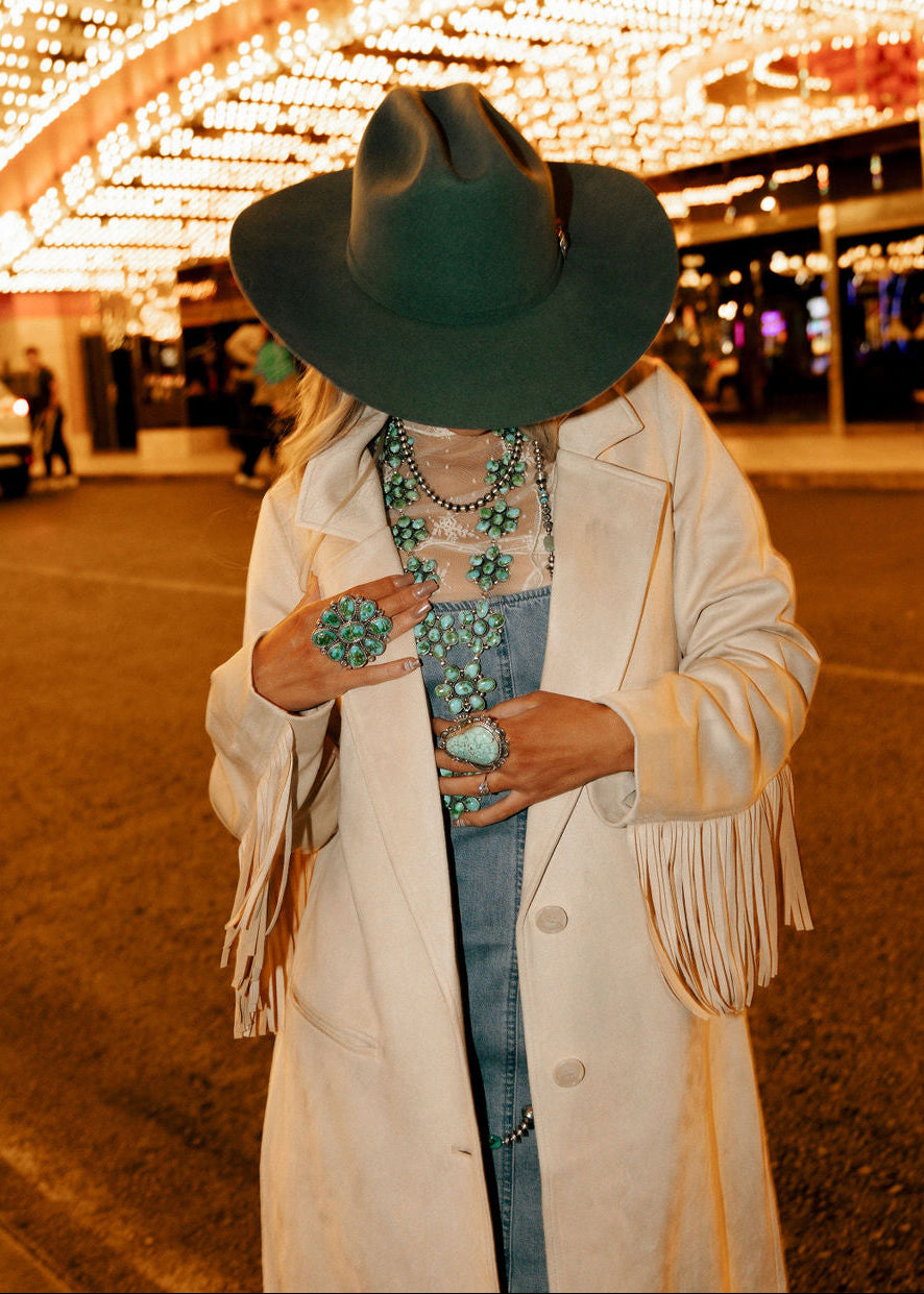 The Fall/Winter Coat of our dreams! The Sierra Fringe Maxi Jacket hits just above the ankle, featuring playful fringe detailing that dances along the sleeves and back to add a touch of movement to your style. From mountain tops to city adventures, this jacket is the perfect carefree topper to all your looks.