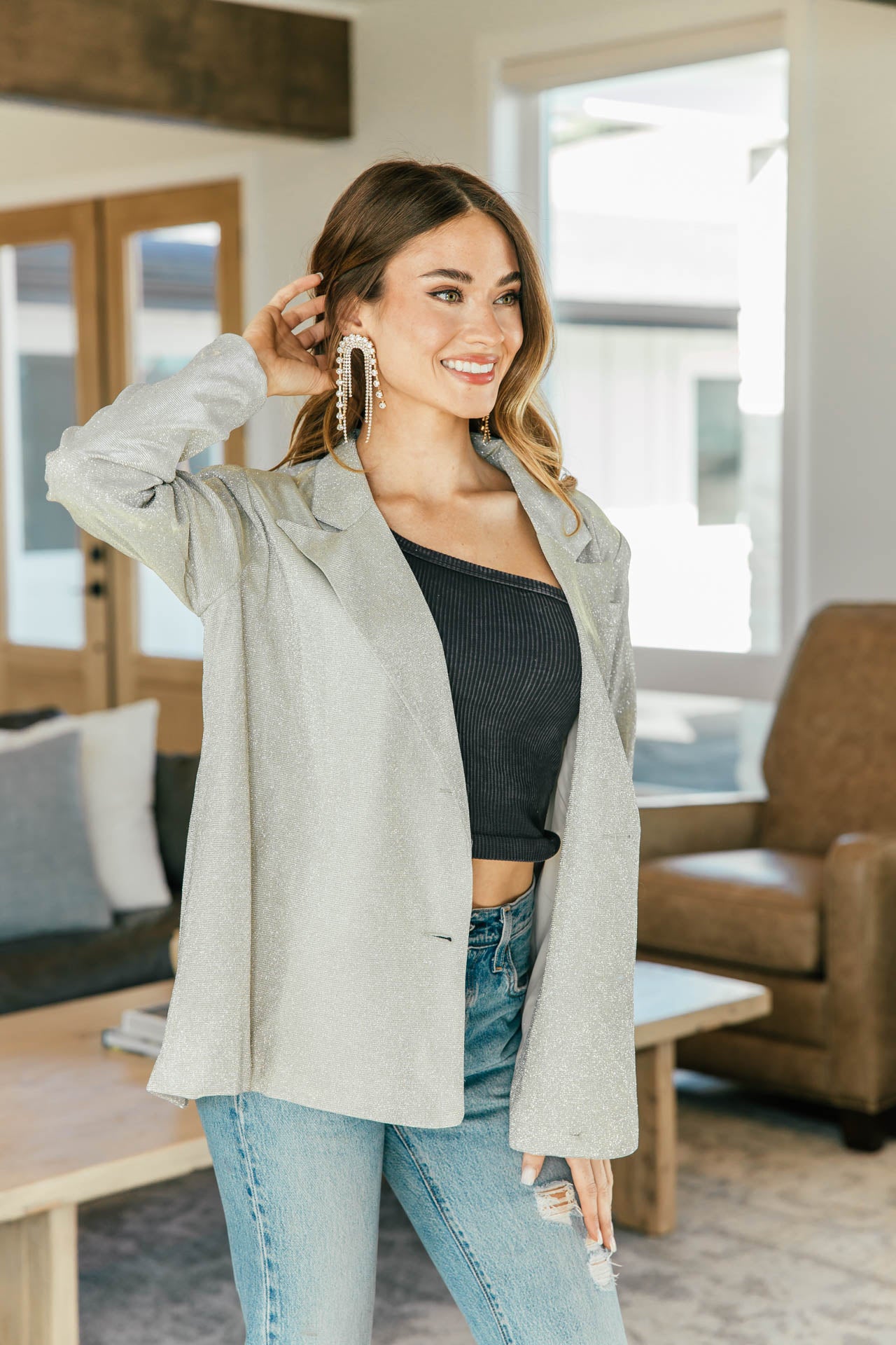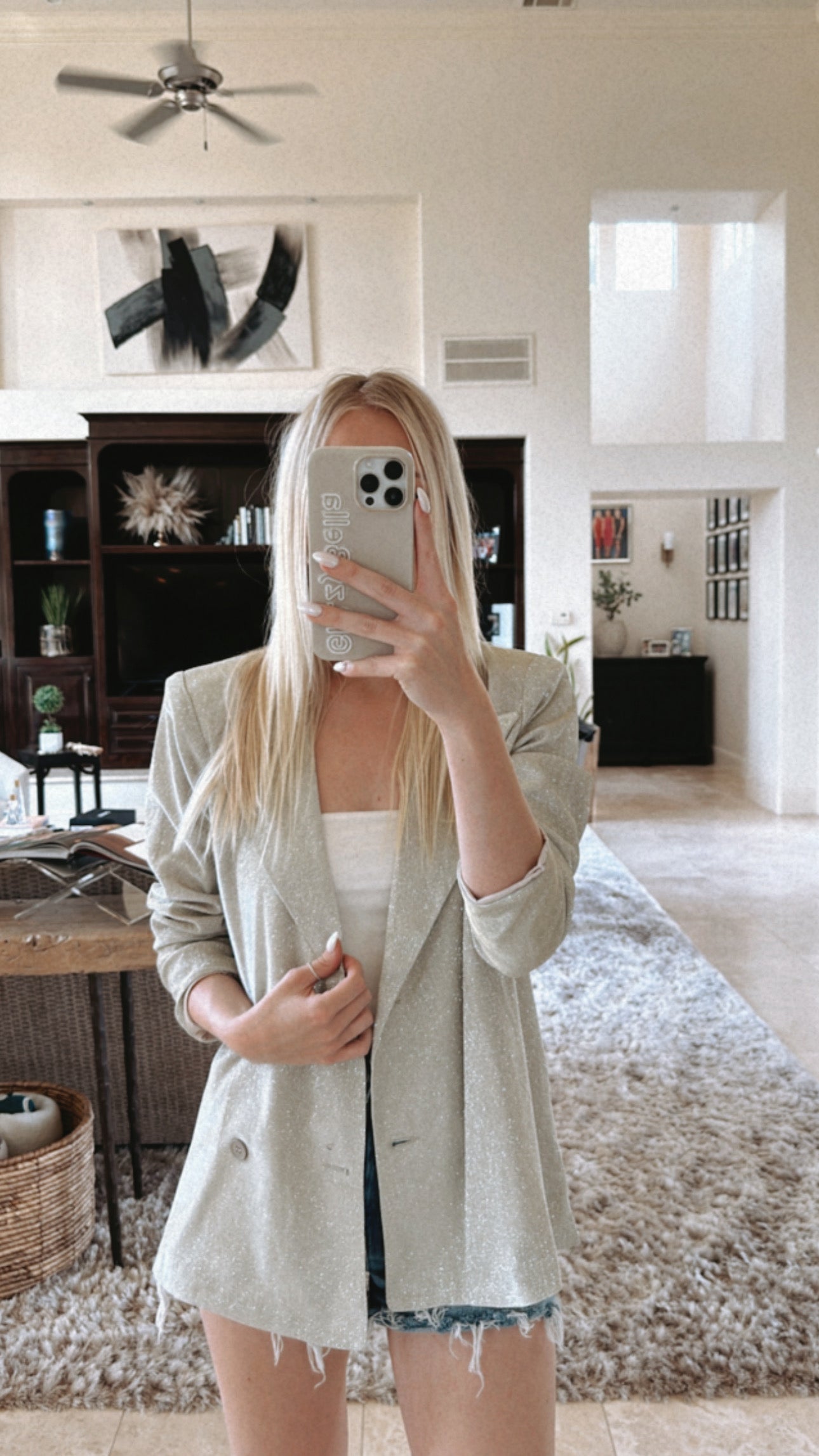 Such a statement piece, this blazer will make getting dressed easier for all your events! Our Shimmer Blazer in pearl is a must have. Easy on the eyes with it's subtle coloring and relaxed, oversized blazer fit make it even better. This will be a great repeat wear, addition to your wardrobe!