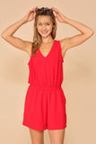 Wear it to the boardwalk, beach days, or for adventures with friends. This trendy romper features a flattering sleeveless design with a stylish front and back v-neck, allowing for a comfortable airflow. The smocked waist adds a touch of detail and enhances the overall look of the outfit. Side pockets are included for added convenience, making it both fashionable and functional. Perfect for a day out or a casual event, this romper combines style with practicality.