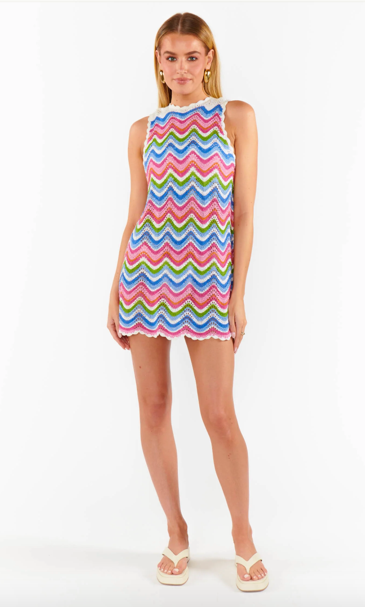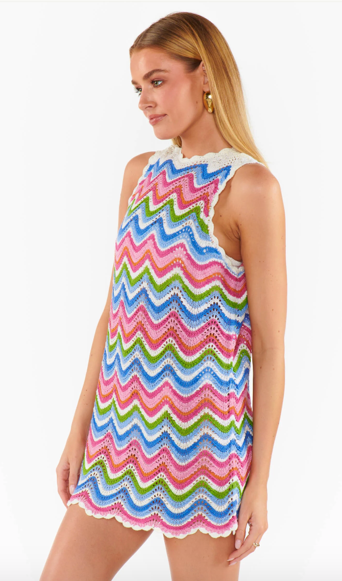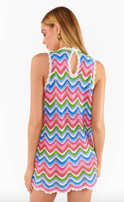 You'll want to wear the Sweeney Coverup every day on vacay! Bright striped crochet creates this easy fit coverup with a high neck and mini hem. Perfect thrown over your favorite swim suit!