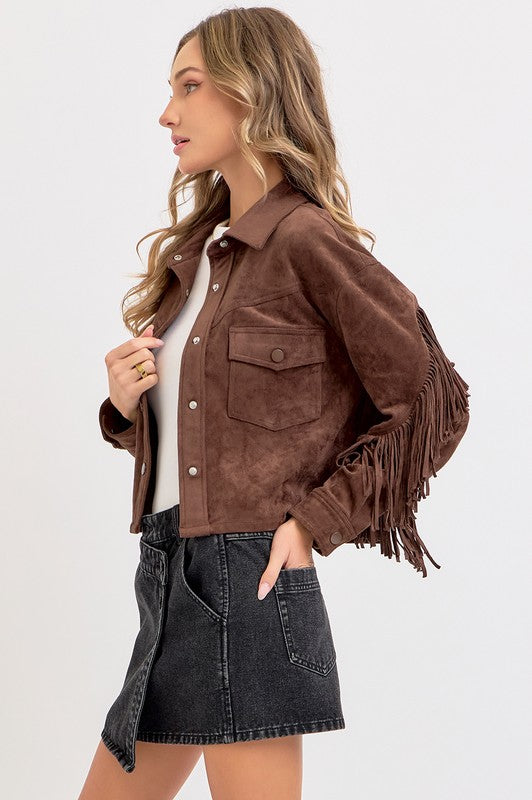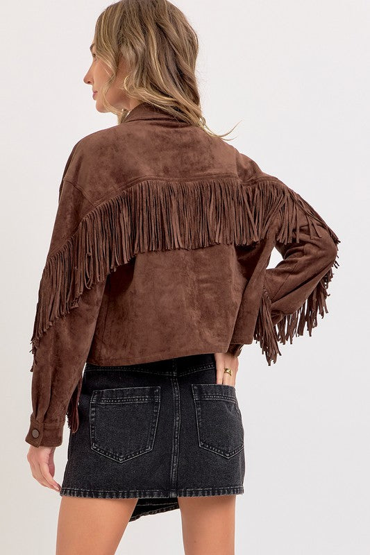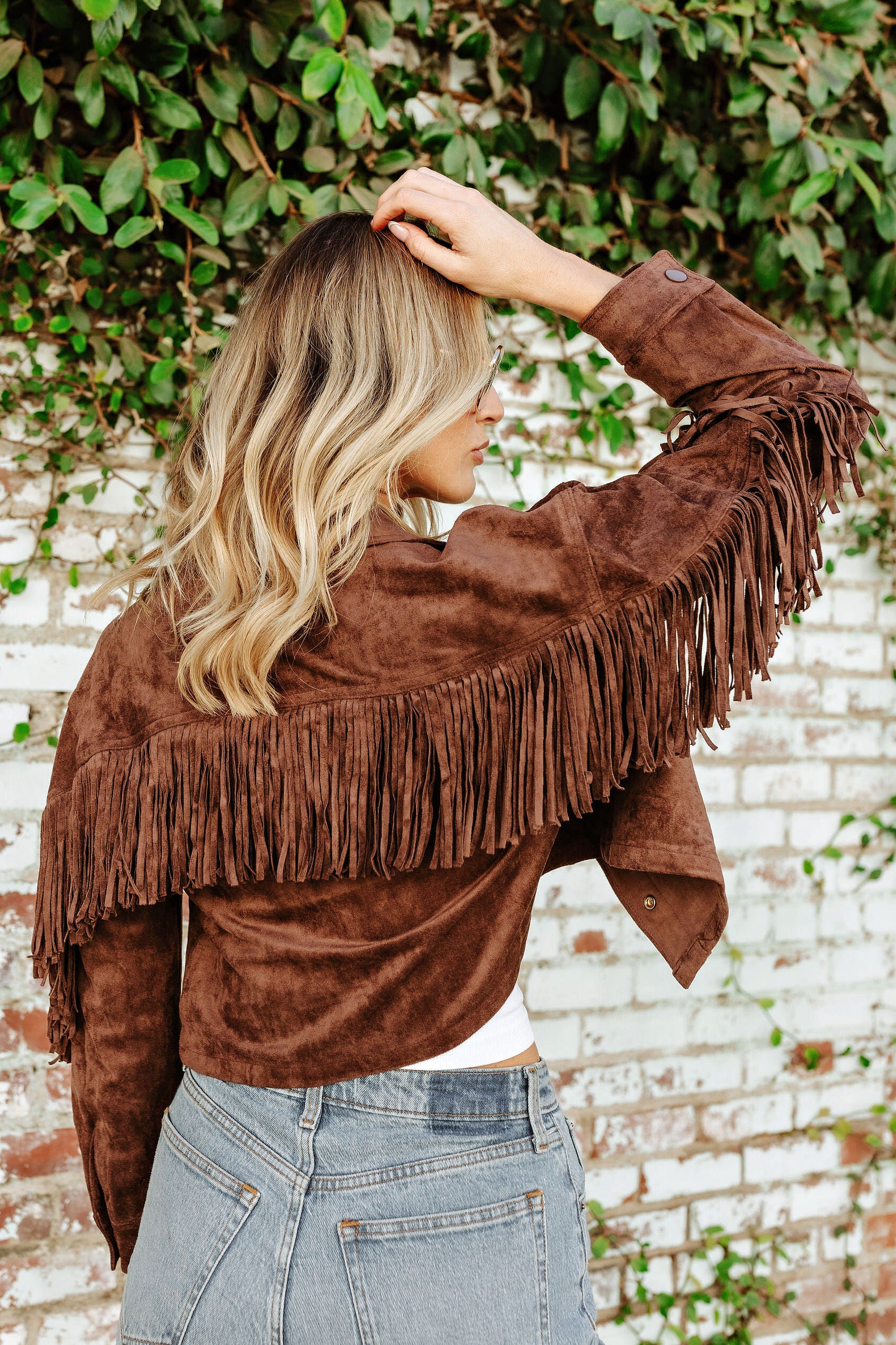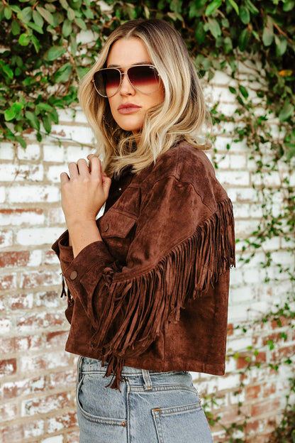 Meet the Telluride Fringe Jacket, where Western edge meets Bohemian charm in perfect harmony. Crafted from smooth faux suede, this jacket features dropped shoulders for a classic silhouette and fringe details for an added touch of flair. Stylish breast snap pockets offers both function and fashion, making it a standout piece for the fall season.