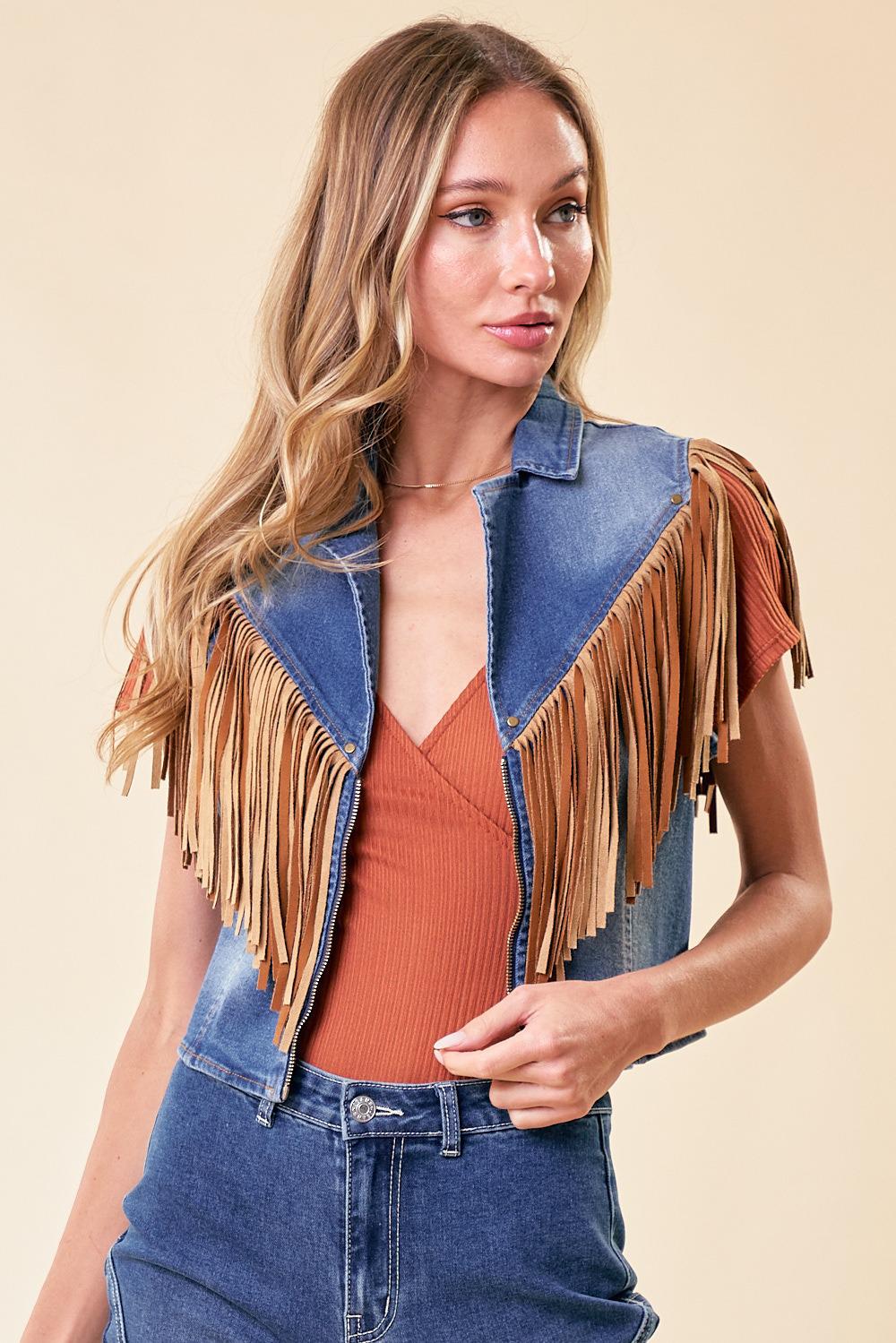 Your new country concert essential! Made from denim and soft faux suede, this fringe shawl feature fabulous fringe on the front and back that sway with every move, adding a playful edge to your look. Style it with a basic white tank and your favorite denim and boots and you're set!