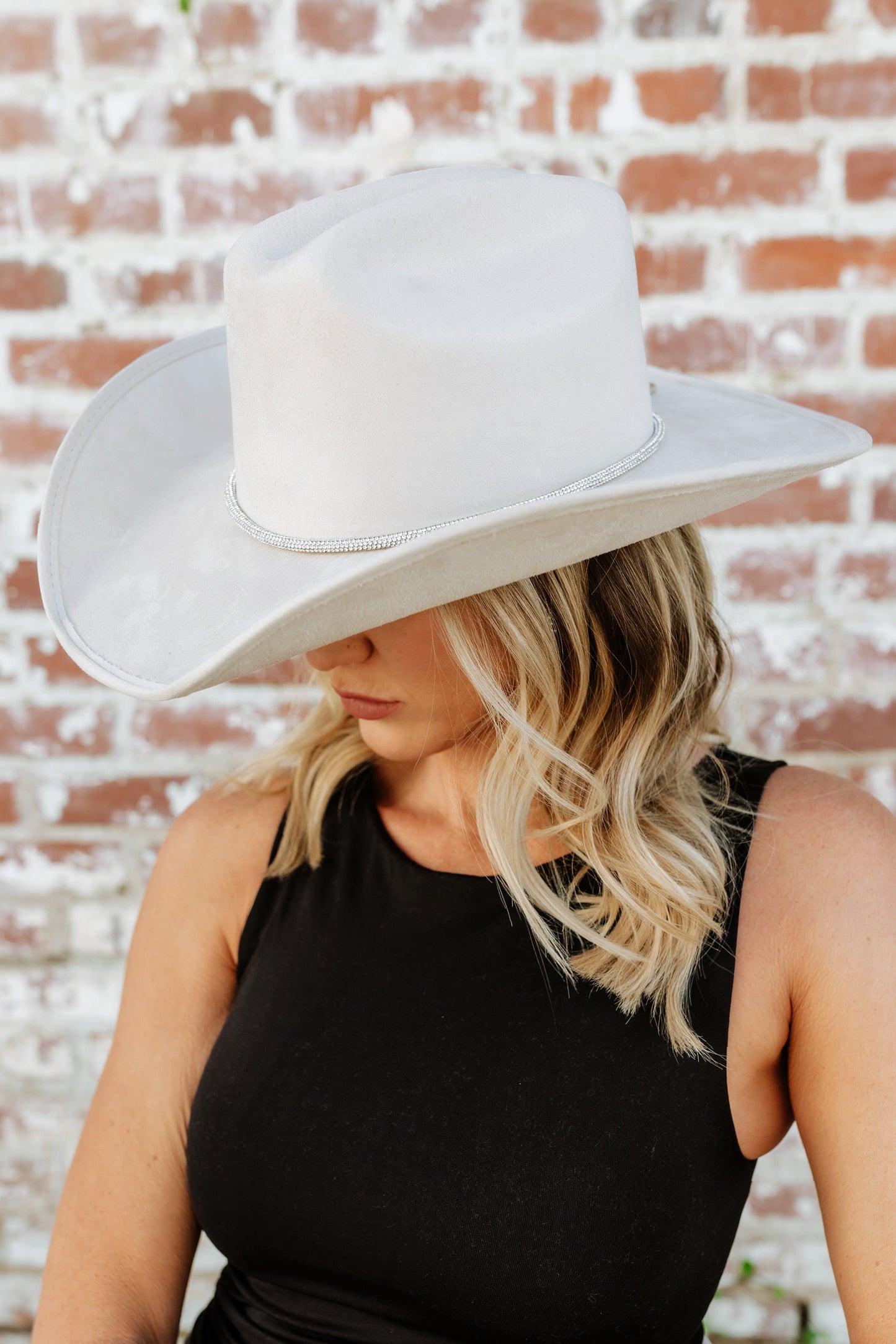 Ummm.... YES!! A timeless and on trend cowboy hat that’s crafted in a ivory faux suede with a coordinating rhinestone band wrapped around. Meet the Kenny Cowboy Hat. The crown is stiffened and shaped into a clean and ridged design.