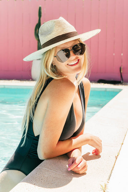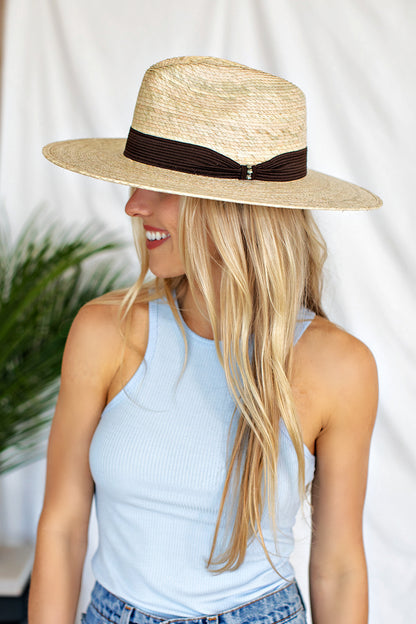 Handmade by artisans in Mexico, our new 100% baked palm leaf Tulum Hat is perfect for spring and summer wear. Featuring a molded crown and tightly woven pressed palm, this hat offers the most sun protection. Embellished with a brown band and Swarovski crystals.