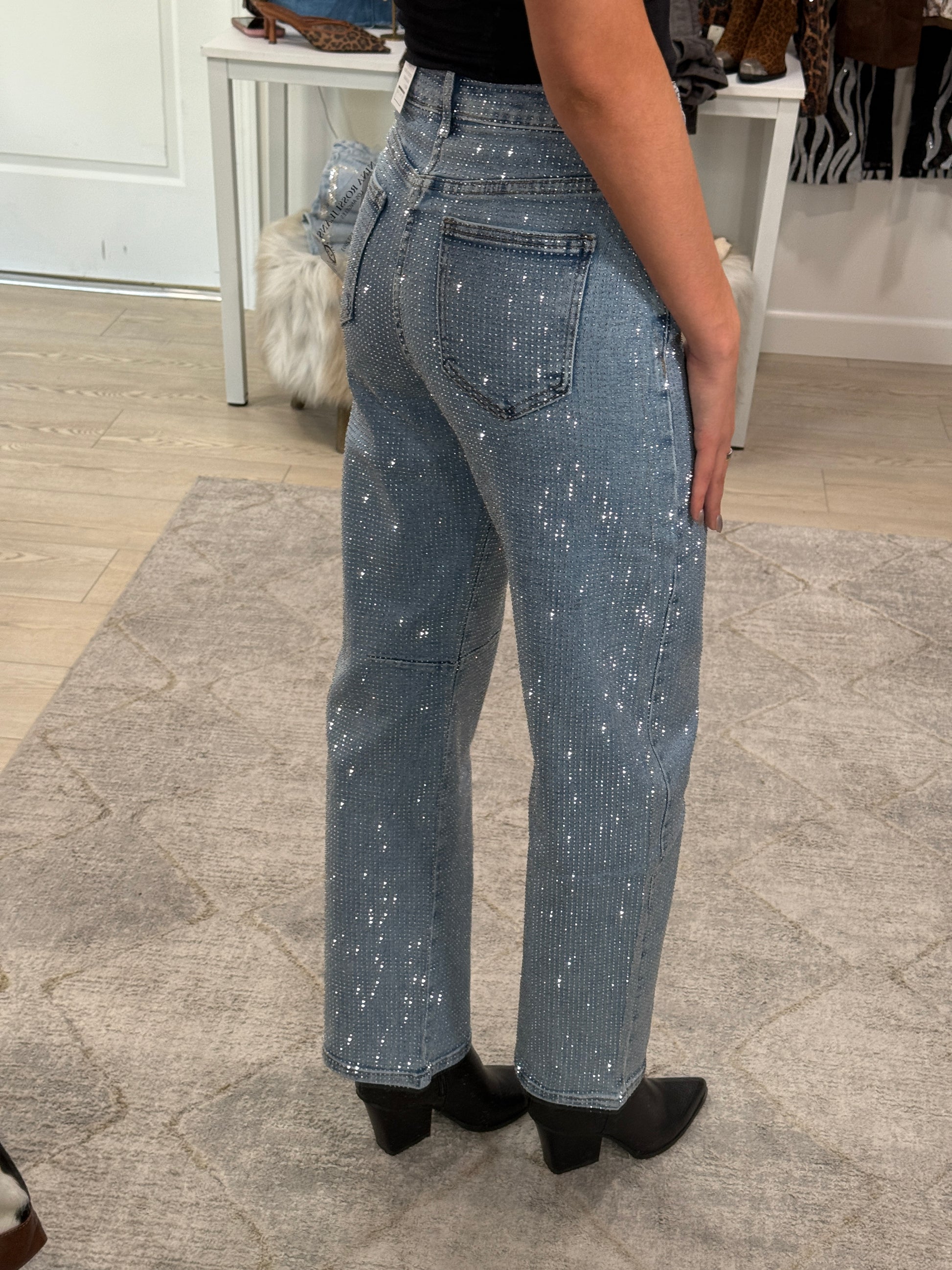 Talk about a statement piece. We found the most Glitzy Bella denim jeans there ever was! Prepare for endless compliments! We recommend sizing up if you're unsure, they do have stretch! Take your time deciding which size to purchase, as these will sell out. If you want them loose at all, size up!