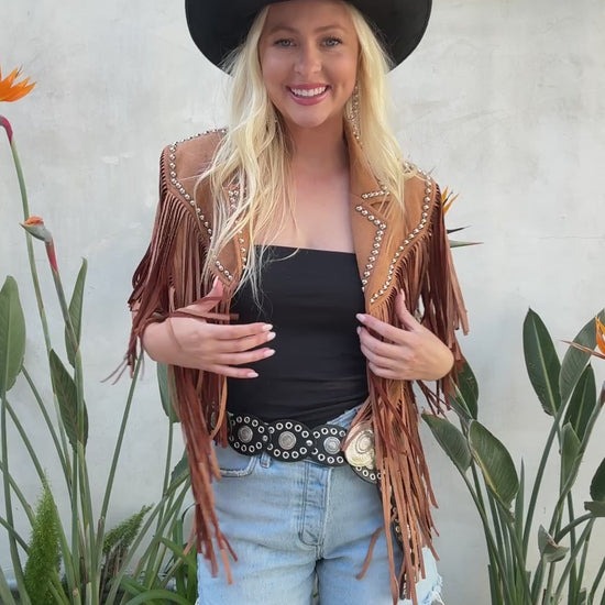 Your new country concert essential! Made from soft faux suede, this fringe shawl feature fabulous fringe and studded details on the front and back that sway with every move, adding a playful edge to your look. Style it with a basic white tank and your favorite denim and boots and you're set!