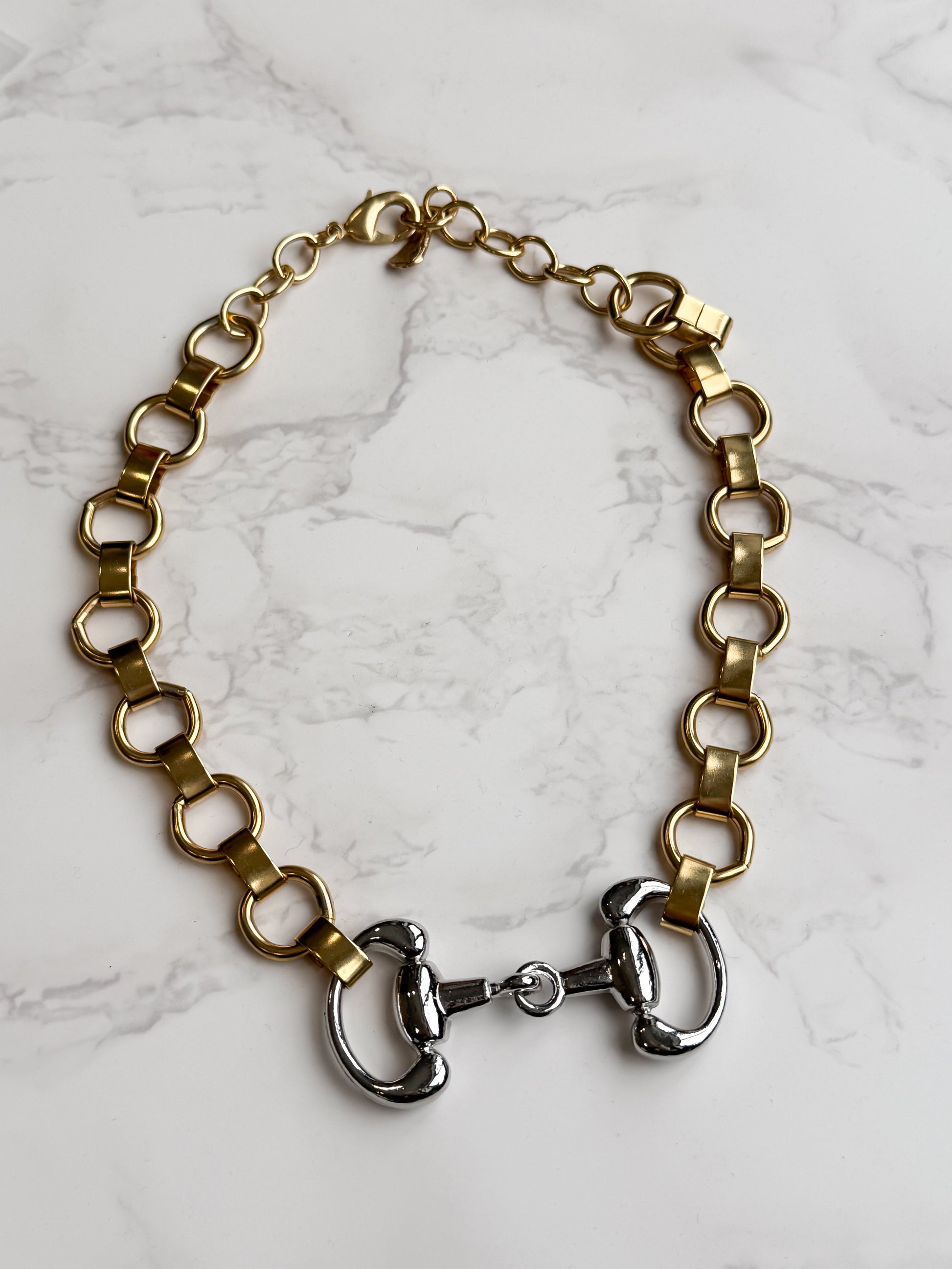 Add a touch of equestrian charm to your look with our Two Tone Snaffle Bit Toggle Necklace. It's sleek design brings a bold yet elegant touch, perfect for turning heads whether you’re dressing up or keeping it casual. Channel a chic, spirited vibe with this unique accessory!