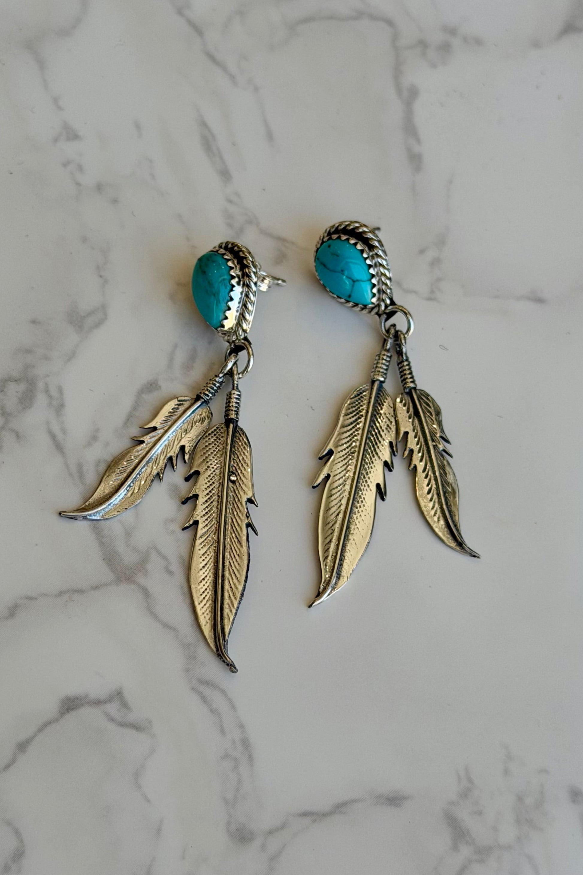 Crafted by Navajo artisans, these sterling silver earrings feature 1 large carefully set Kingman Turquoise stones in each piece, showcasing exceptional craftsmanship and authentic design.